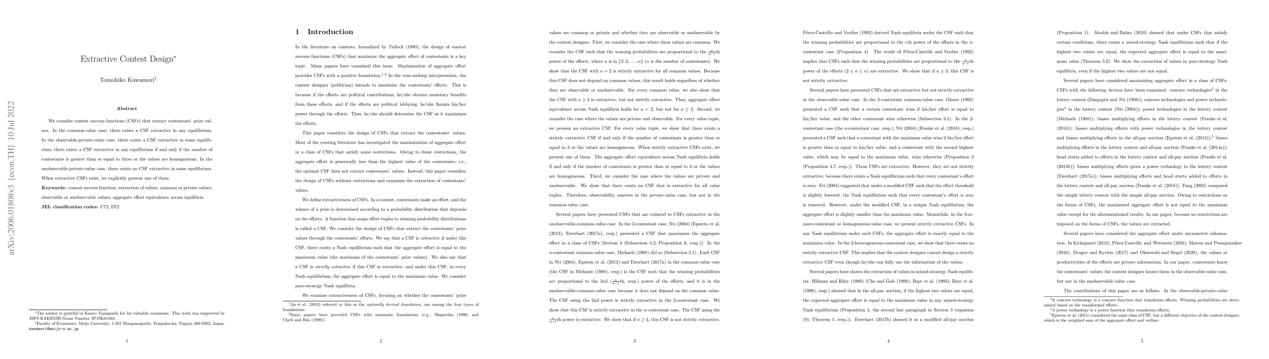 This paper explores contest success functions (CSFs) that allow extraction of contestants' prize values, showing that extractive CSFs exist in equilibria under certain conditions, particularly when the number of contestants is three or more or when values are homogeneous. It also highlights the absence of extractive CSFs in some unobservable-private-value scenarios.