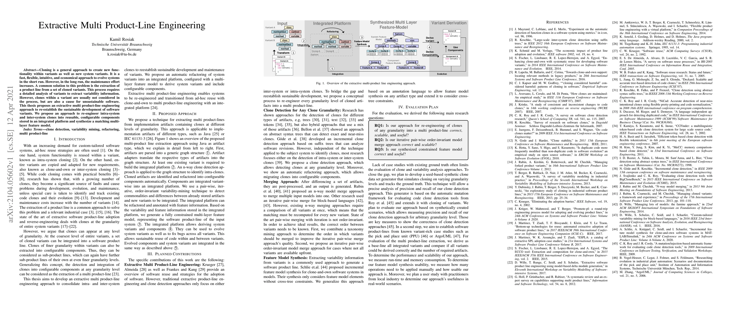 This paper proposes an extractive multi-product-line engineering approach to manage and re-engineer clones within and between software variants, aiming to improve long-term sustainability and maintainability by transforming clones into reusable components. The approach synthesizes a multi-layer feature model to facilitate this process.