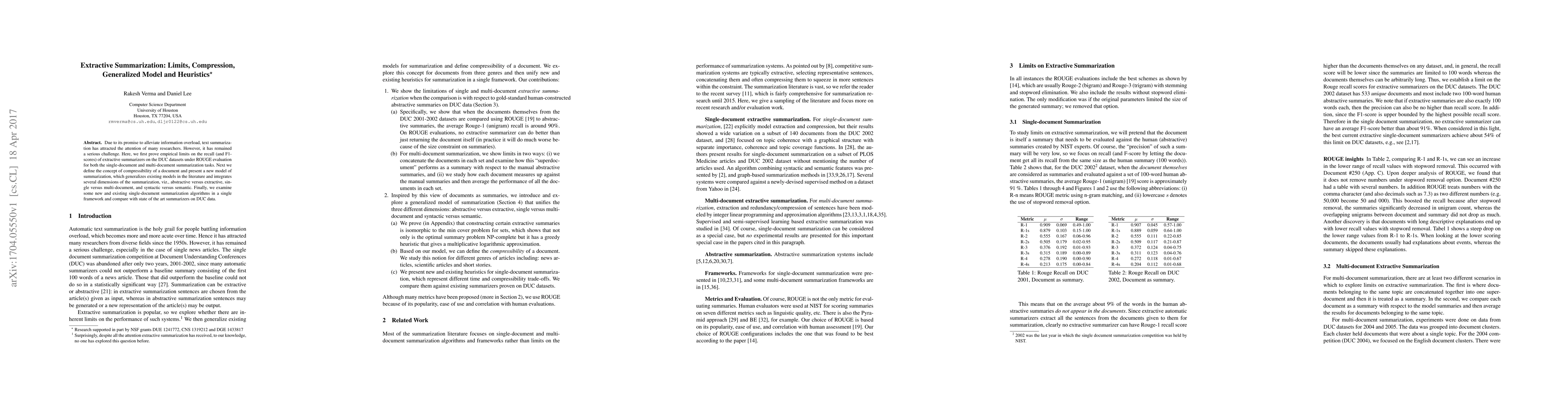 This paper investigates the empirical limits of extractive summarization, proving constraints on recall and F1-scores on DUC datasets. It introduces a generalized summarization model that encompasses various dimensions and compares several algorithms within a unified framework against state-of-the-art summarizers.
