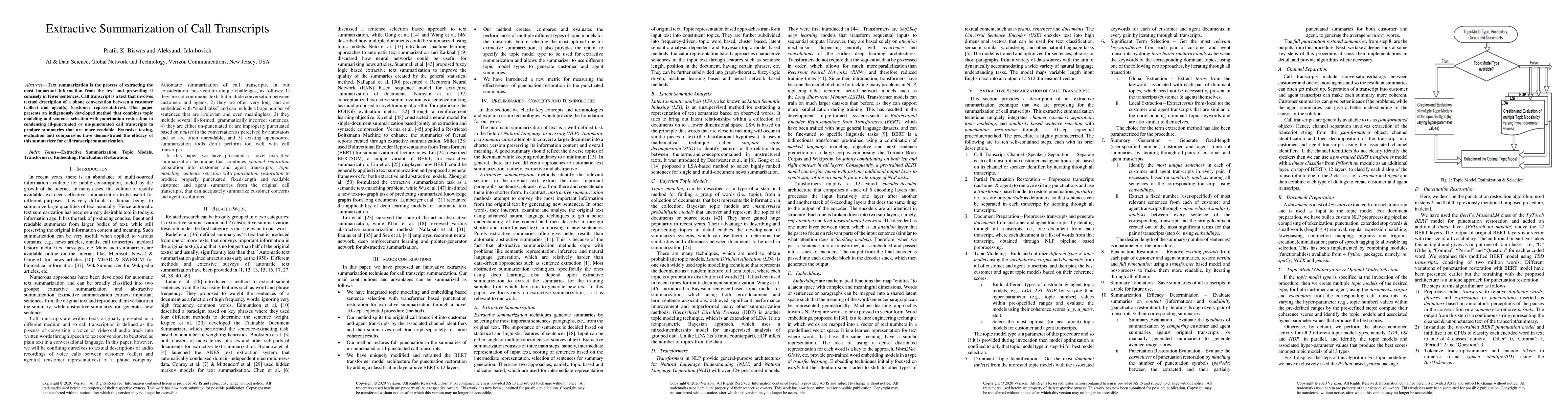 This paper introduces a method for extractive summarization of call transcripts that combines topic modeling and sentence selection with punctuation restoration to improve readability. Extensive testing shows the effectiveness of this approach for summarizing ill-punctuated call transcripts.