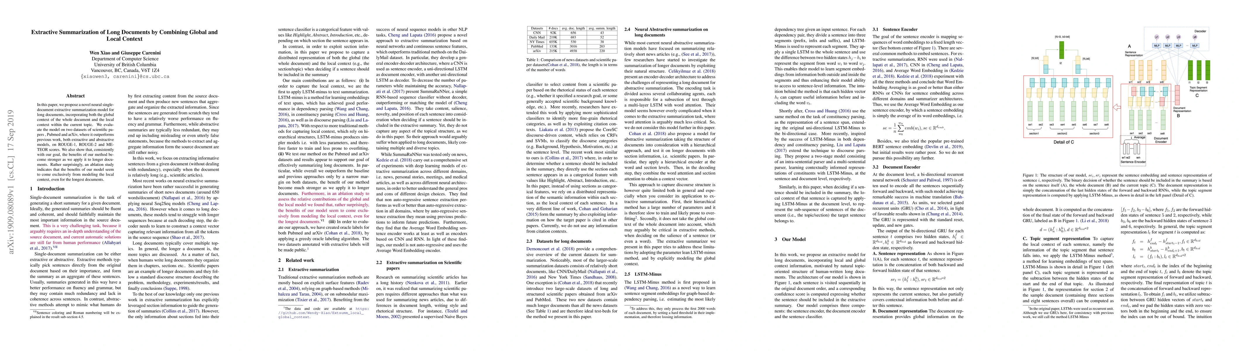 This paper introduces a neural extractive summarization model for long documents that combines global and local contexts, achieving superior performance on scientific paper datasets compared to previous models. Surprisingly, the model's benefits appear to stem primarily from local context modeling, despite its design to incorporate both global and local context.