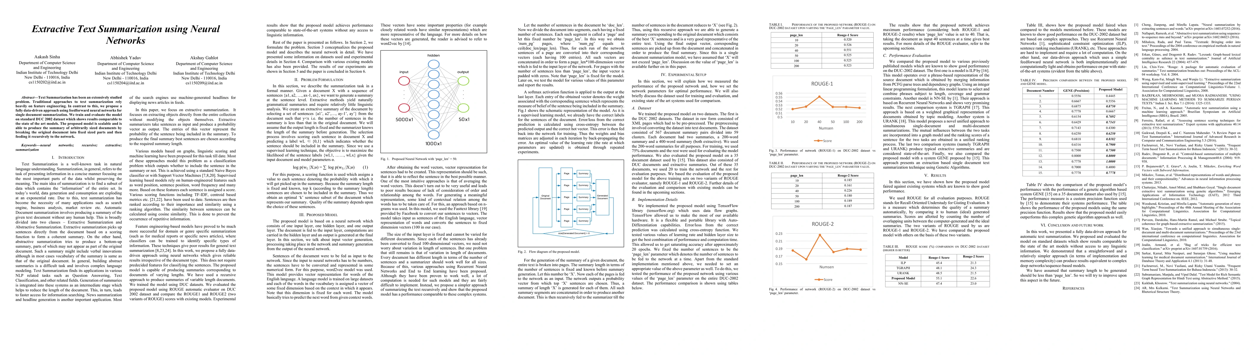 This paper proposes a fully data-driven neural network approach for extractive text summarization, demonstrating comparable results to state-of-the-art models on the DUC 2002 dataset. The model is scalable and can handle arbitrarily large documents by recursively processing fixed-sized parts.