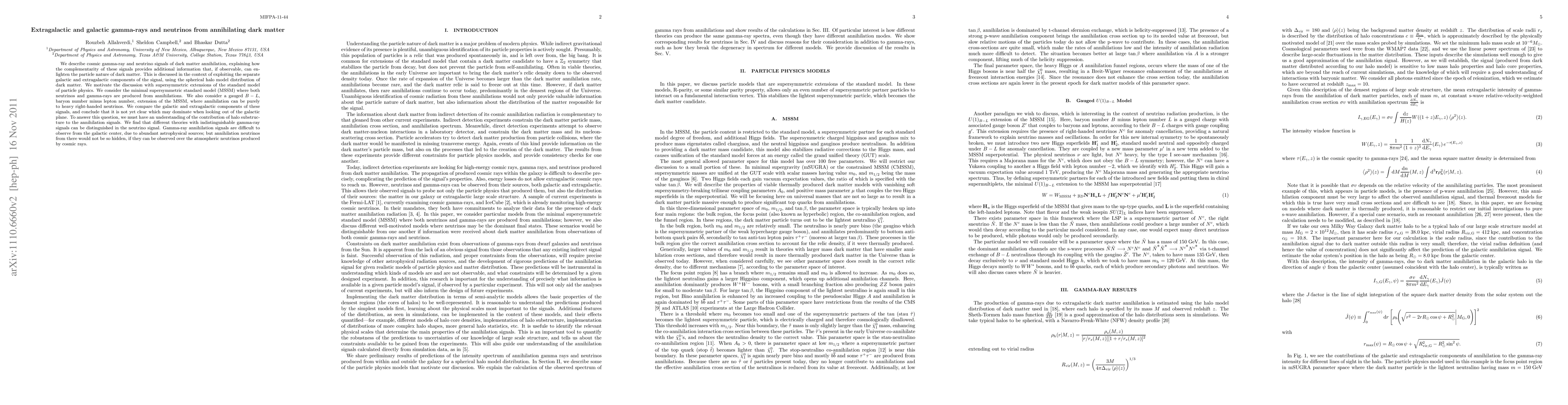 We describe cosmic gamma-ray and neutrino signals of dark matter annihilation, explaining how the complementarity of these signals provides additional information that, if observable, can enlighten the particle nature of dark matter. This is discussed in the context of exploiting the separate galactic and extragalactic components of the signal, using the spherical halo model distribution of dark matter. We motivate the discussion with supersymmetric extensions of the standard model of particle physics. We consider the minimal supersymmetric standard model (MSSM) where both neutrinos and gamma-rays are produced from annihilations. We also consider a gauged B-L, baryon number minus lepton number, extension of the MSSM, where annihilation can be purely to heavy right-handed neutrinos. We compare the galactic and extragalactic components of these signals, and conclude that it is not yet clear which may dominate when looking out of the galactic plane. To answer this question, we must have an understanding of the contribution of halo substructure to the annihilation signals. We find that different theories with indistinguishable gamma-ray signals can be distinguished in the neutrino signal. Gamma-ray annihilation signals are difficult to observe from the galactic center, due to abundant astrophysical sources; but annihilation neutrinos from there would not be so hidden, if they can be observed over the atmospheric neutrinos produced by cosmic rays.