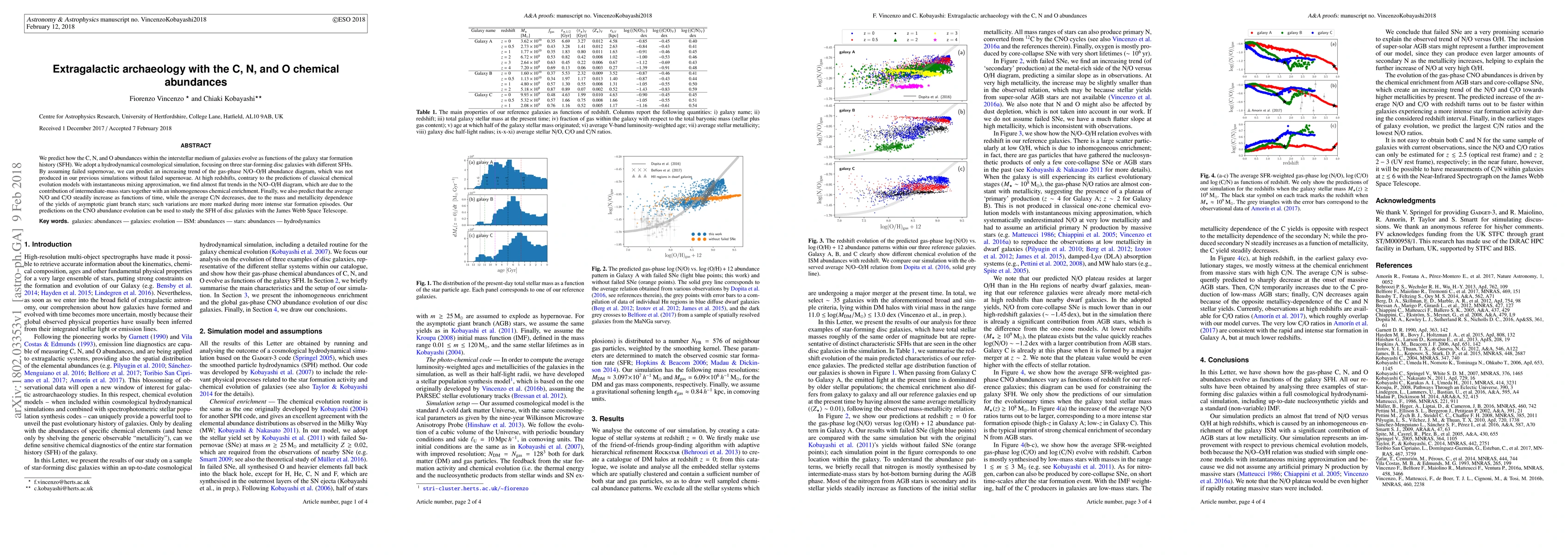 We predict how the C, N, and O abundances within the interstellar medium of galaxies evolve as functions of the galaxy star formation history (SFH). We adopt a hydrodynamical cosmological simulation, focusing on three star-forming disc galaxies with different SFHs. By assuming failed supernovae, we can predict an increasing trend of the gas-phase N/O--O/H abundance diagram, which was not produced in our previous simulations without failed supernovae. At high redshifts, contrary to the predictions of classical chemical evolution models with instantaneous mixing approximation, we find almost flat trends in the N/O--O/H diagram, which are due to the contribution of intermediate-mass stars together with an inhomogeneous chemical enrichment. Finally, we also predict that the average N/O and C/O steadily increase as functions of time, while the average C/N decreases, due to the mass and metallicity dependence of the yields of asymptotic giant branch stars; such variations are more marked during more intense star formation episodes. Our predictions on the CNO abundance evolution can be used to study the SFH of disc galaxies with the James Webb Space Telescope.