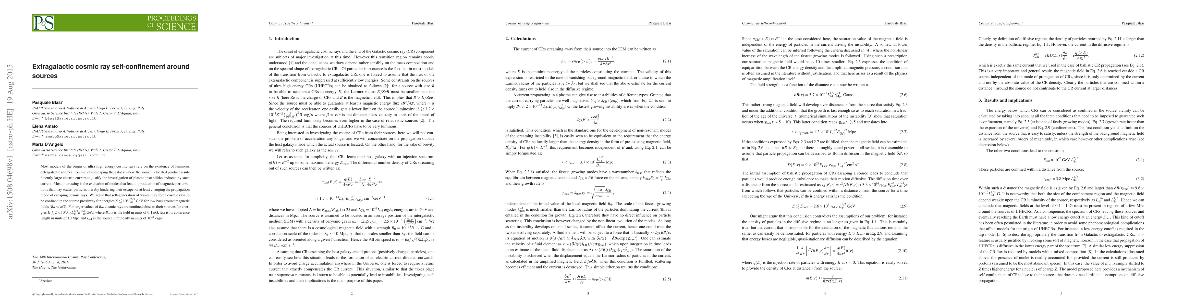 Most models of the origin of ultra high energy cosmic rays rely on the existence of luminous extragalactic sources. Cosmic rays escaping the galaxy where the source is located produce a sufficiently large electric current to justify the investigation of plasma instabilities induced by such current. Most interesting is the excitation of modes that lead to production of magnetic perturbations that may scatter particles thereby hindering their escape, or at least changing the propagation mode of escaping cosmic rays. We argue that self-generation of waves may force cosmic rays to be confined in the source proximity for energies $E\lesssim 10^{7} L_{44}^{2/3}$ GeV for low background magnetic fields ($B_{0}\ll nG$). For larger values of $B_{0}$, cosmic rays are confined close to their sources for energies $E\lesssim 2\times 10^{8} \lambda_{10} L_{44}^{1/4} B_{-10}^{1/2}$ GeV, where $B_{-10}$ is the field in units of $0.1$ nG, $\lambda_{10}$ is its coherence length in units of 10 Mpc and $L_{44}$ is the source luminosity in units of $10^{44}$ erg/s.