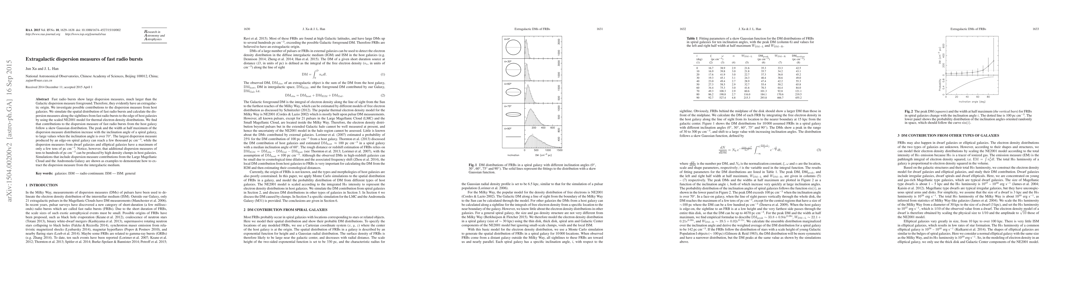 This paper investigates the extragalactic dispersion measures of fast radio bursts, finding that their large dispersion measures indicate an extragalactic origin. Simulations reveal that host galaxies contribute to dispersion measures following a skew Gaussian distribution, with significant contributions from edge-on spiral galaxies, dwarf galaxies, and elliptical galaxies, as well as high-density clumps.
