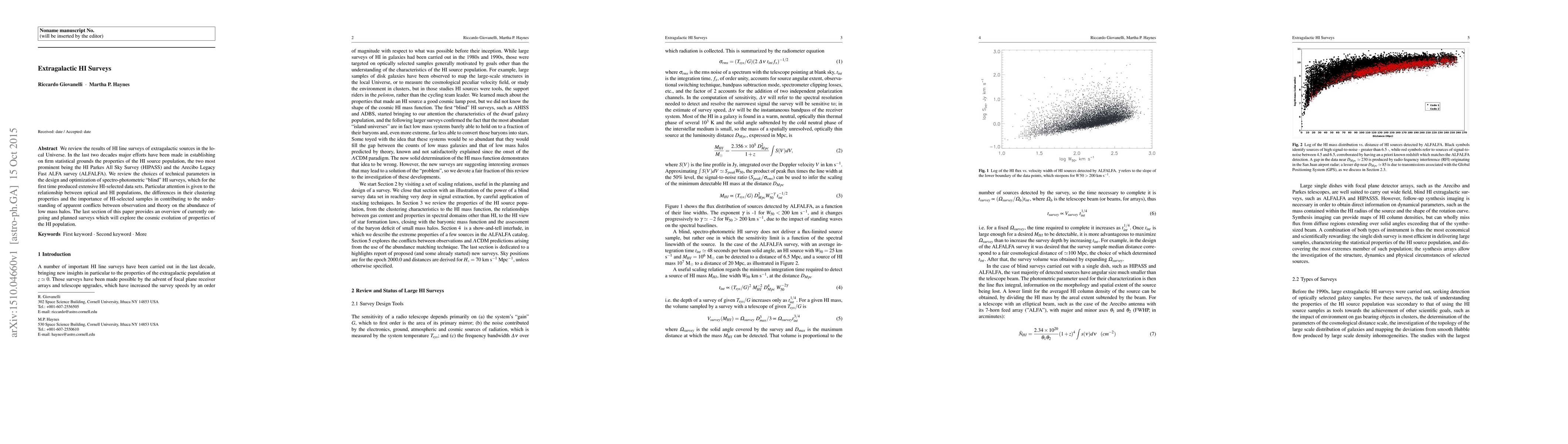 The paper reviews extragalactic HI surveys, focusing on technical parameters and statistical grounds of HI source properties. It highlights the HI Parkes All Sky Survey (HIPASS) and the Arecibo Legacy Fast ALFA survey (ALFALFA) as major contributions, and discusses the relationship between optical and HI populations.
