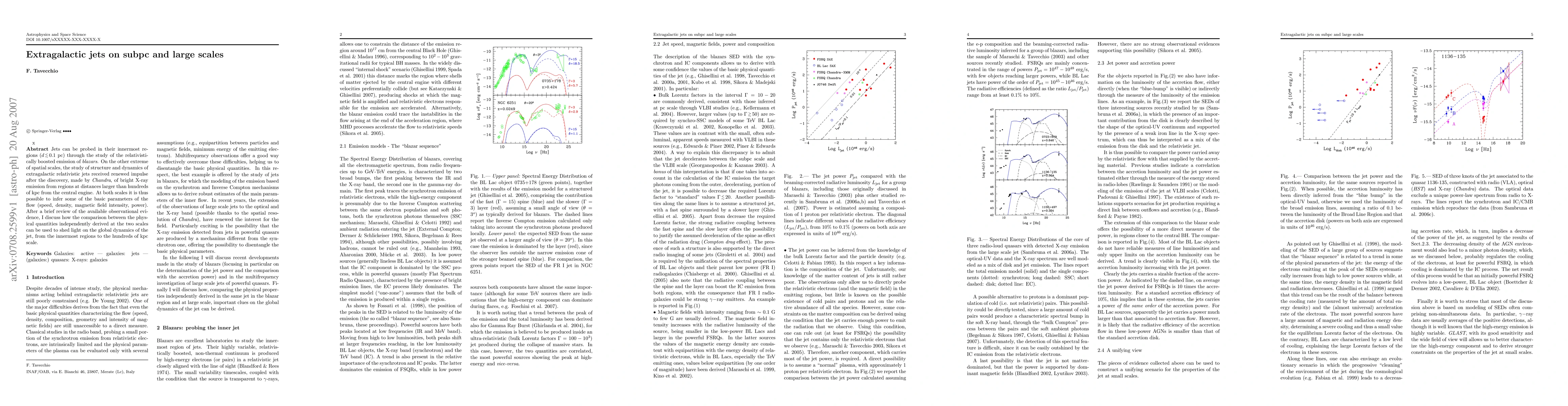 This paper reviews observational evidence of extragalactic jets at both sub-parsec and kilo-parsec scales, highlighting how comparative analysis of physical parameters across these scales can reveal the global dynamics of the jet. The study uses relativistically-boosted emission from blazars and X-ray observations from Chandra to infer jet properties.