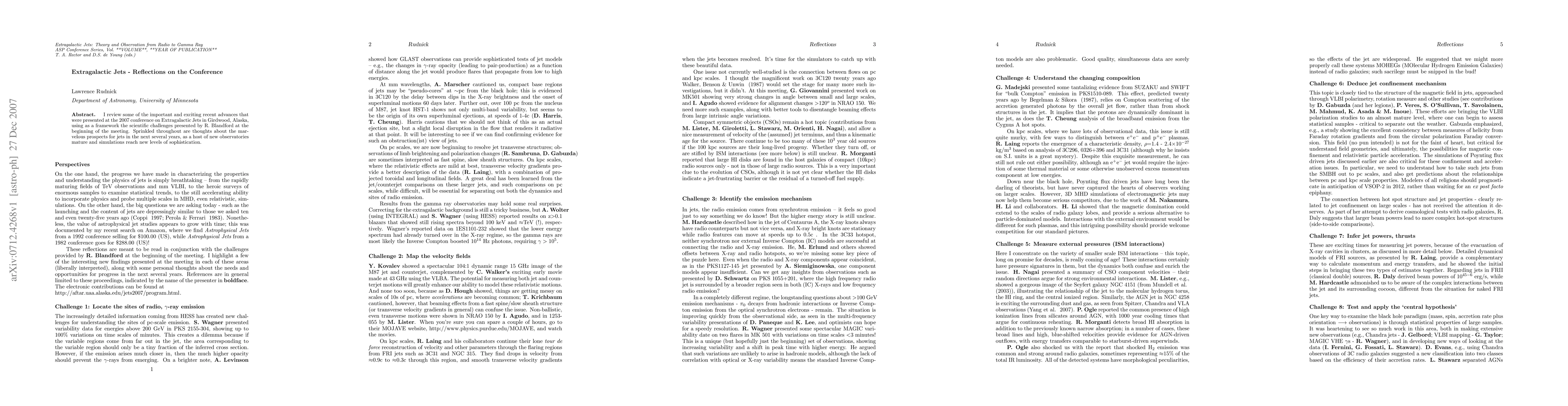 I review some of the important and exciting recent advances that were presented at the 2007 conference on Extragalactic Jets in Girdwood, Alaska, using as a framework the scientific challenges presented by R. Blandford at the beginning of the meeting. Sprinkled throughout are thoughts about the marvelous prospects for jets in the next several years, as a host of new observatories mature and simulations reach new levels of sophistication.