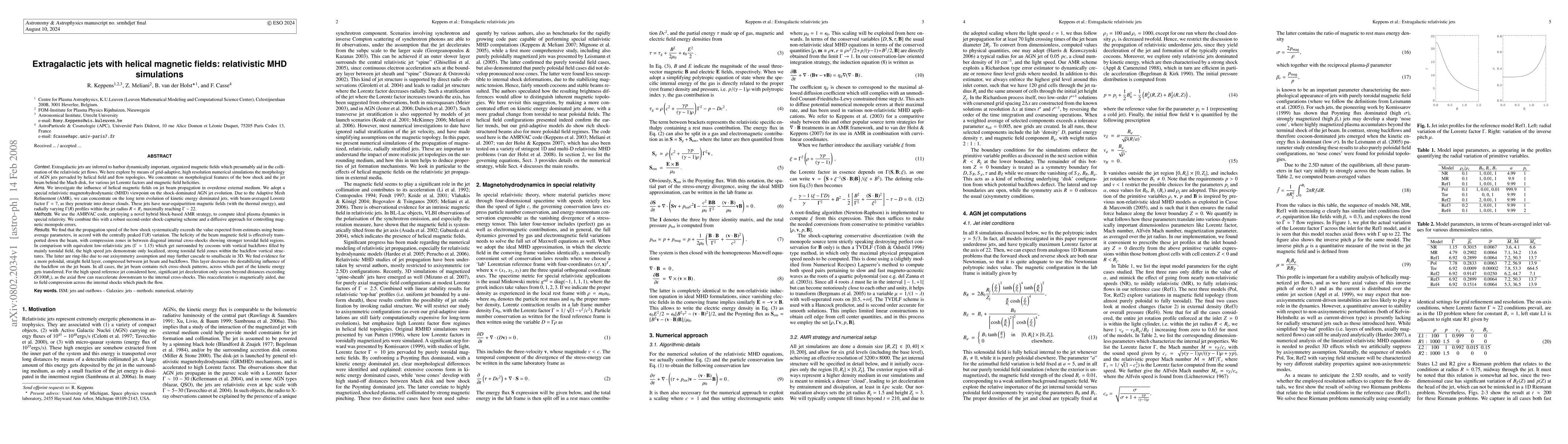 This study employs relativistic MHD simulations to investigate the morphology of AGN jets with helical magnetic fields, focusing on bow shock features and jet beam propagation. It reveals that helical fields compress toroidal fields into strong regions between internal cross-shocks, leading to a more poloidal field layer that mitigates jet destabilization, with significant deceleration occurring far downstream due to magnetic reacceleration.