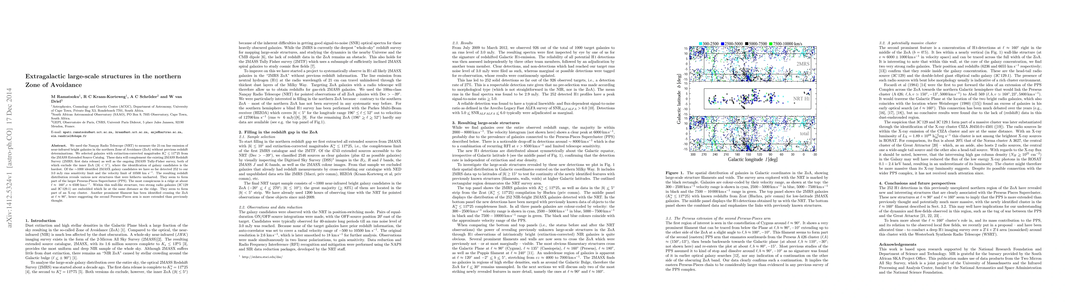 This study uses radio telescope data to map galaxy structures in the northern Zone of Avoidance, revealing a new ridge, strong radio galaxies, and an extended Perseus-Pisces Supercluster.
