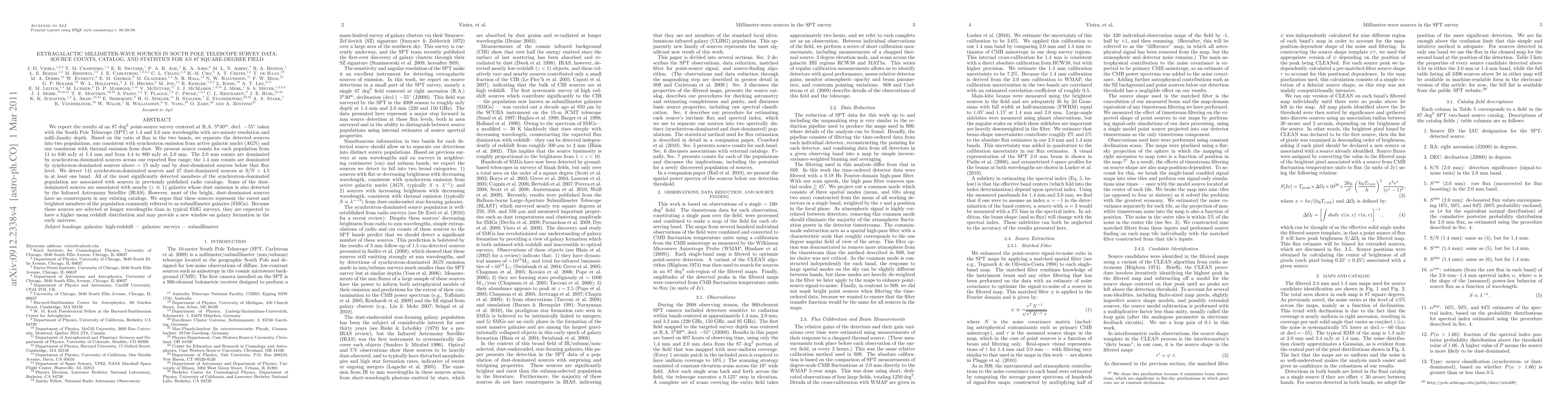 This paper reports on an 87 square-degree survey using the South Pole Telescope at millimeter wavelengths, identifying two populations of sources: synchrotron-dominated active galactic nuclei (AGN) and dust-dominated sub-millimeter galaxies (SMGs). The study reveals distinct source counts for each population, suggesting a higher mean redshift for the brightest SMGs.