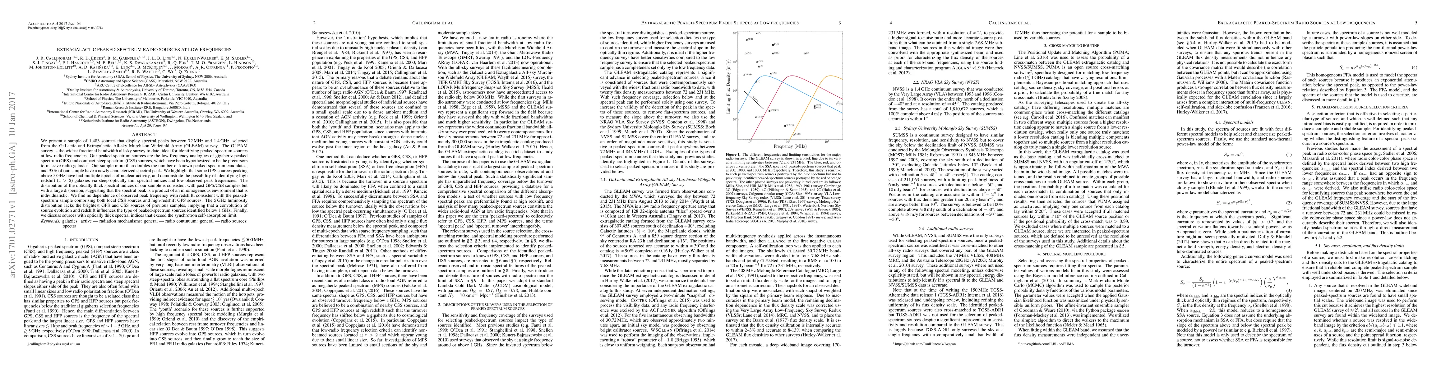 This paper presents a large sample of 1,483 extragalactic radio sources with spectral peaks identified in the low-frequency range of 72 MHz to 1.4 GHz from the GLEAM survey, more than doubling the known number of such sources. The study suggests these sources are low-frequency analogs of GPS and CSS sources, potentially precursors to massive radio galaxies, and highlights the possibility of identifying high-redshift galaxies through their spectral characteristics.