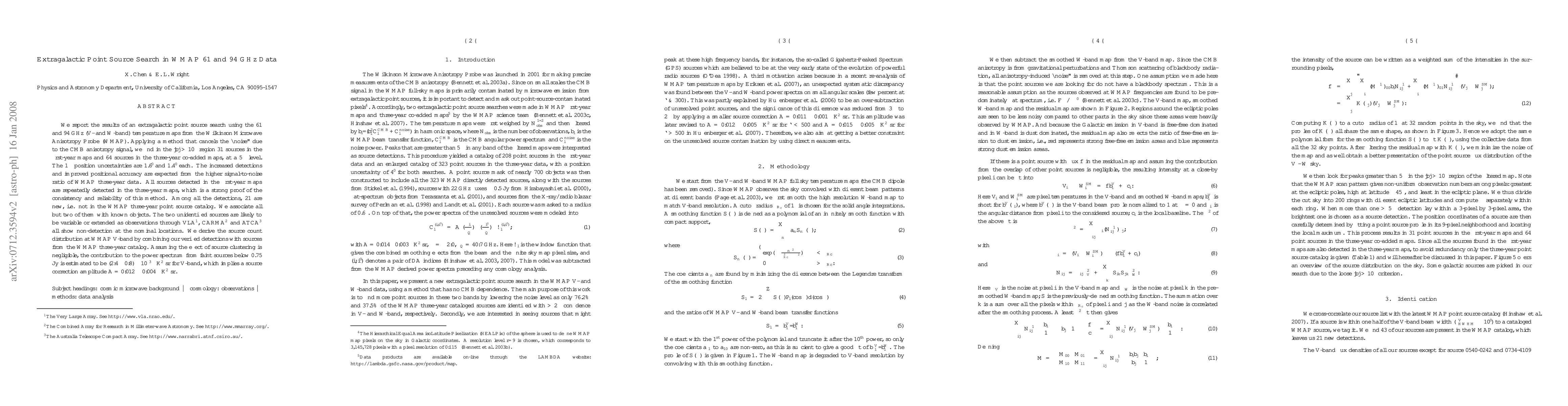 This study identifies 31 extragalactic point sources in WMAP's first-year data and 64 in the three-year co-added data at 61 and 94 GHz, using a method that cancels CMB anisotropy noise. The improved detections and accuracy in the three-year data highlight the higher signal-to-noise ratio, with 21 new sources not previously cataloged.