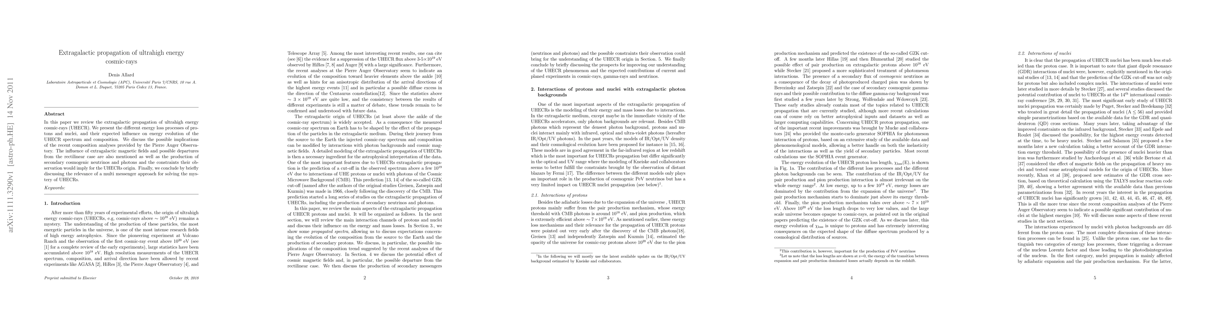 In this paper we review the extragalactic propagation of ultrahigh energy cosmic-rays (UHECR). We present the different energy loss processes of protons and nuclei, and their expected influence on energy evolution of the UHECR spectrum and composition. We discuss the possible implications of the recent composition analyses provided by the Pierre Auger Observatory. The influence of extragalactic magnetic fields and possible departures from the rectilinear case are also mentioned as well as the production of secondary cosmogenic neutrinos and photons and the constraints their observation would imply for the UHECRs origin. Finally, we conclude by briefly discussing the relevance of a multi messenger approach for solving the mystery of UHECRs.