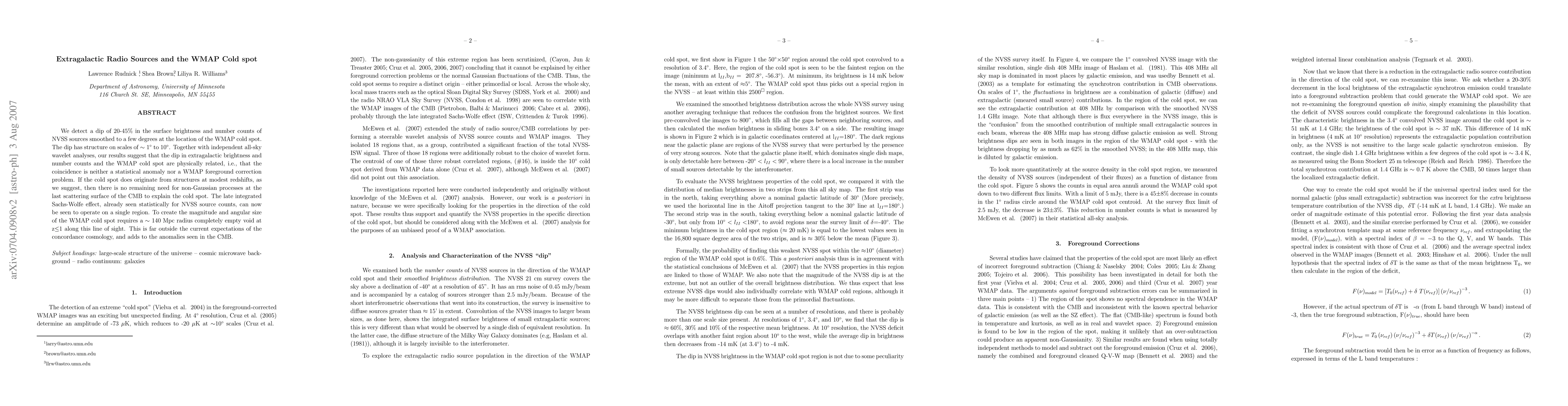 This paper finds a significant dip in extragalactic radio sources' brightness and number counts near the WMAP cold spot, suggesting a physical connection rather than a statistical fluke. A large, nearly empty void at modest redshifts is proposed to explain the cold spot, challenging current cosmological models.