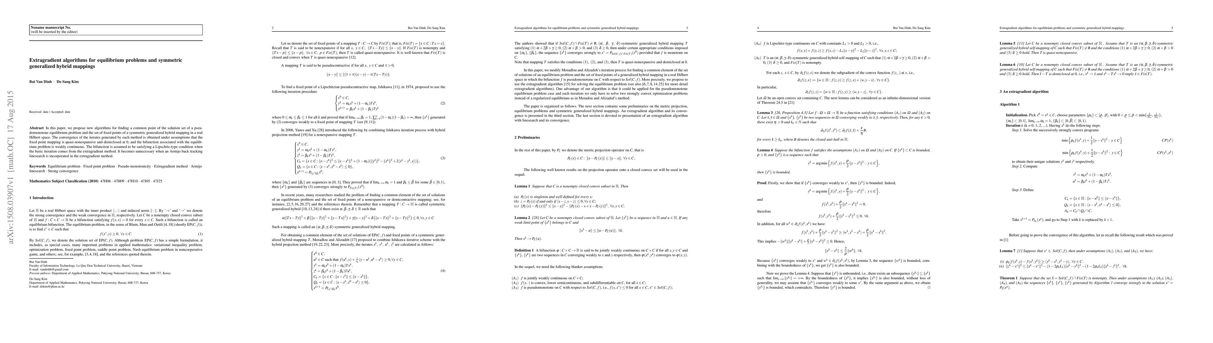 This paper introduces new algorithms based on extragradient methods for solving equilibrium problems and finding fixed points of symmetric generalized hybrid mappings in Hilbert spaces. The proposed algorithms converge under conditions including quasi-nonexpansiveness and demiclosedness of the fixed point mapping, and weak continuity of the associated bifunction.