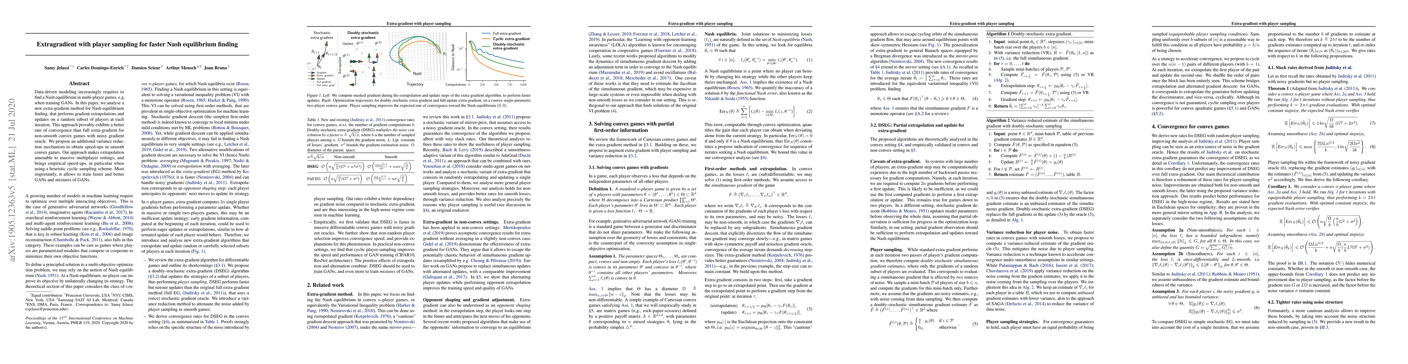 Data-driven modeling increasingly requires to find a Nash equilibrium in multi-player games, e.g. when training GANs. In this paper, we analyse a new extra-gradient method for Nash equilibrium finding, that performs gradient extrapolations and updates on a random subset of players at each iteration. This approach provably exhibits a better rate of convergence than full extra-gradient for non-smooth convex games with noisy gradient oracle. We propose an additional variance reduction mechanism to obtain speed-ups in smooth convex games. Our approach makes extrapolation amenable to massive multiplayer settings, and brings empirical speed-ups, in particular when using a heuristic cyclic sampling scheme. Most importantly, it allows to train faster and better GANs and mixtures of GANs.