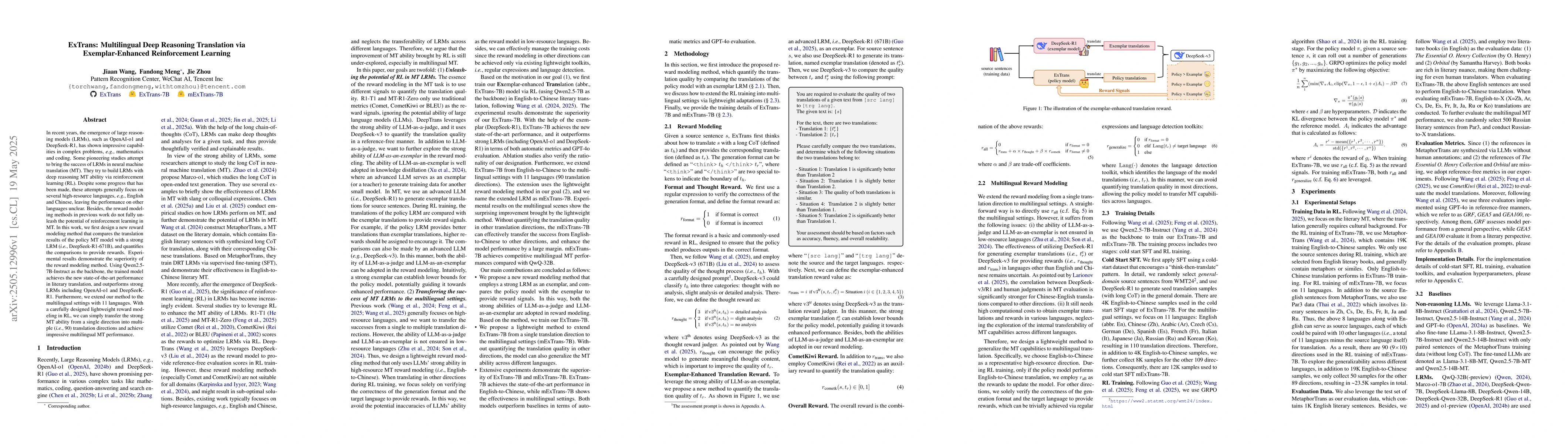 The research introduces ExTrans, a multilingual deep reasoning translation system that leverages exemplar-enhanced reinforcement learning. It employs a novel reward modeling method comparing policy MT model outputs with a strong LRM (DeepSeek-R1-671B) to quantify and provide rewards.