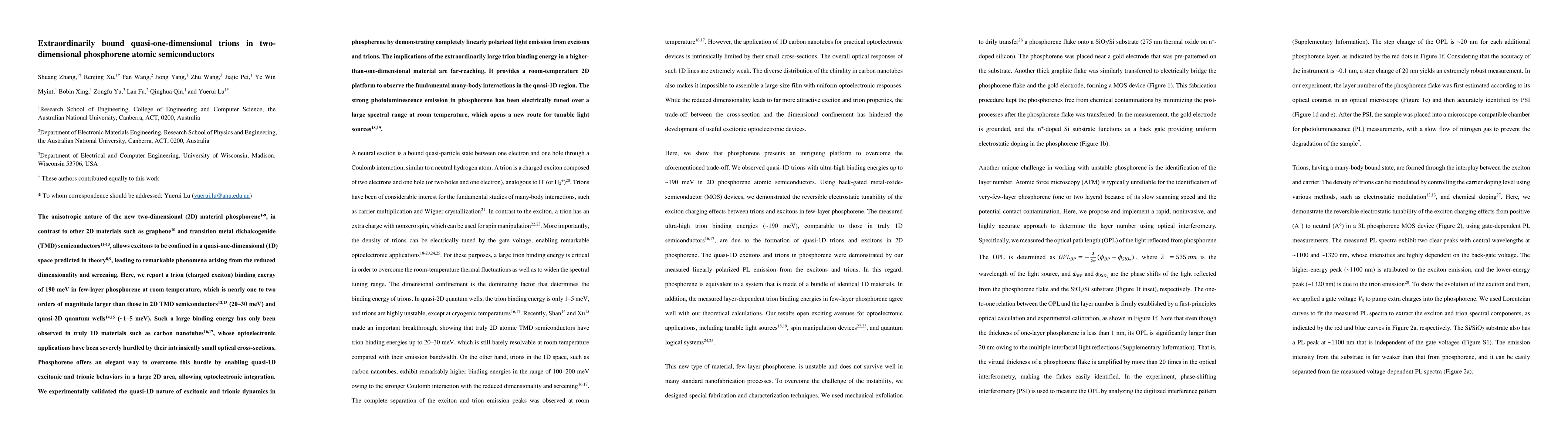 This paper reports extraordinarily large trion binding energy in few-layer phosphorene, a quasi-one-dimensional 2D material, reaching 190 meV at room temperature, significantly higher than in other 2D semiconductors. This discovery enables optoelectronic integration and offers a tunable light source platform.