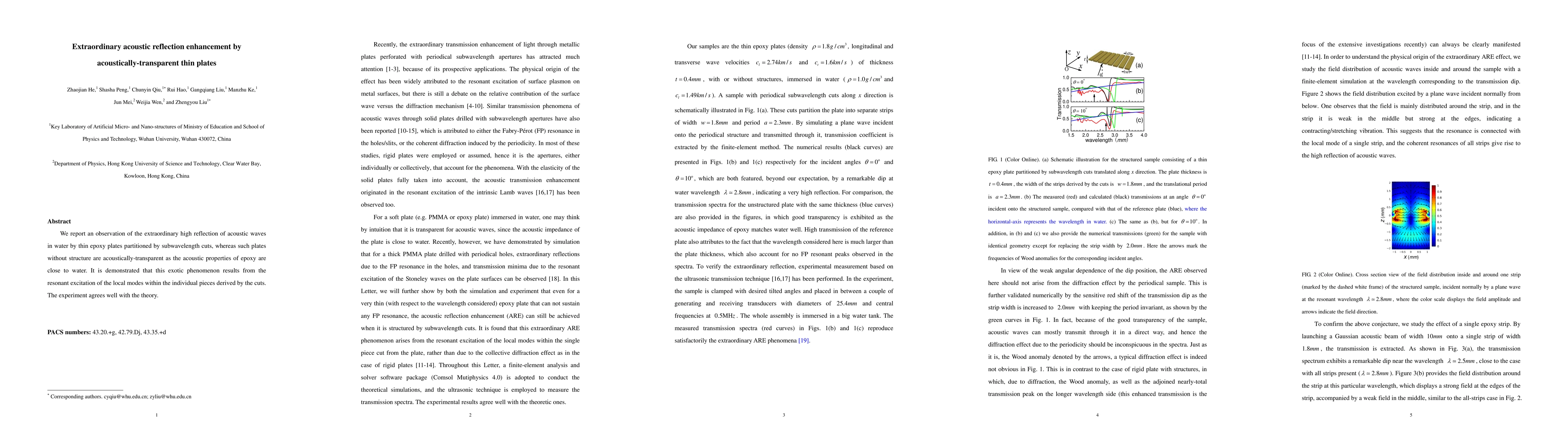 This study reveals high acoustic wave reflection in water by thin epoxy plates with subwavelength cuts, contrasting their otherwise acoustically-transparent nature. This reflection enhancement is attributed to resonant excitation of local modes within the cut pieces, corroborated by theoretical predictions.