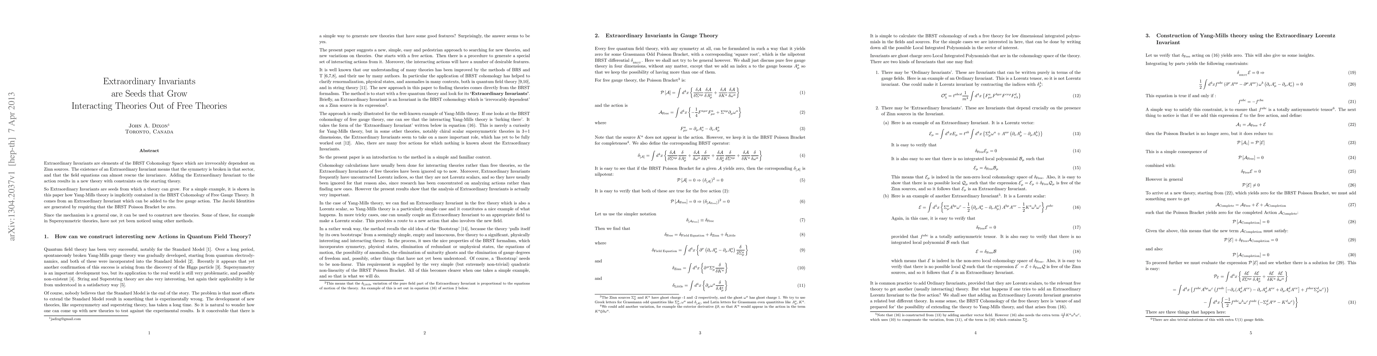 Extraordinary Invariants are elements of the BRST Cohomology Space which are irrevocably dependent on Zinn sources. The existence of an Extraordinary Invariant means that the symmetry is broken in that sector, and that the field equations can almost rescue the invariance. Adding the Extraordinary Invariant to the action results in a new theory with constraints on the starting theory. So Extraordinary Invariants are seeds from which a theory can grow. For a simple example, it is shown in this paper how Yang Mills theory is implicitly contained in the BRST Cohomology of Free Gauge Theory. It comes from an Extraordinary Invariant which can be added to the free gauge action. The Jacobi Identities are generated by requiring that the BRST Poisson Bracket be zero. Since the mechanism is a general one, it can be used to construct new theories. Some of these, for example in Supersymmetric theories, have not yet been noticed using other methods.