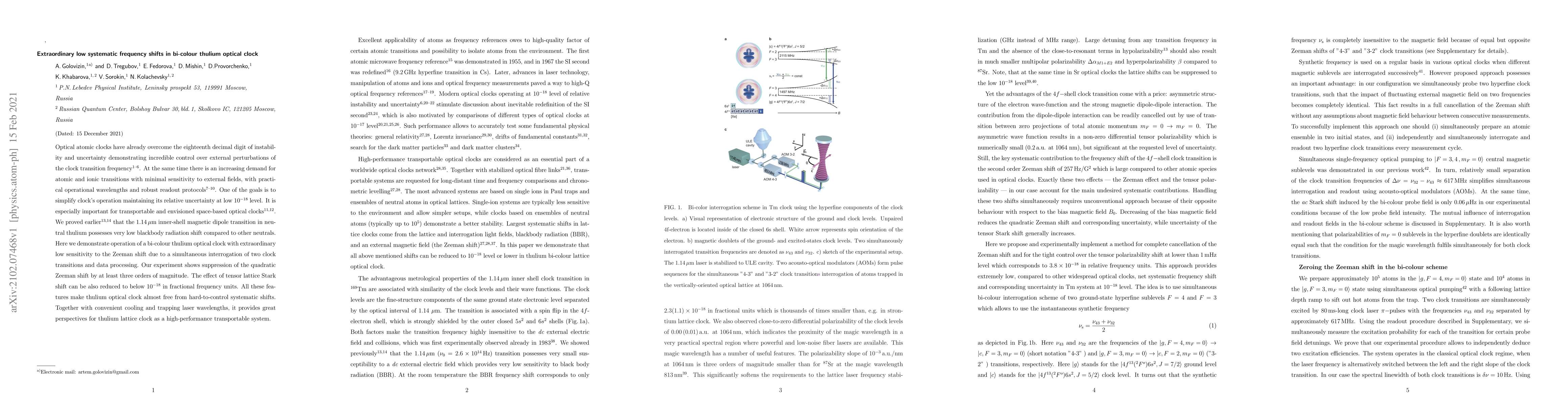 This paper demonstrates the operation of a bi-colour thulium optical clock with minimal systematic frequency shifts, achieving suppression of quadratic Zeeman shift by three orders of magnitude and reducing tensor lattice Stark shift below 10^-18, making it a highly stable and transportable high-performance clock.
