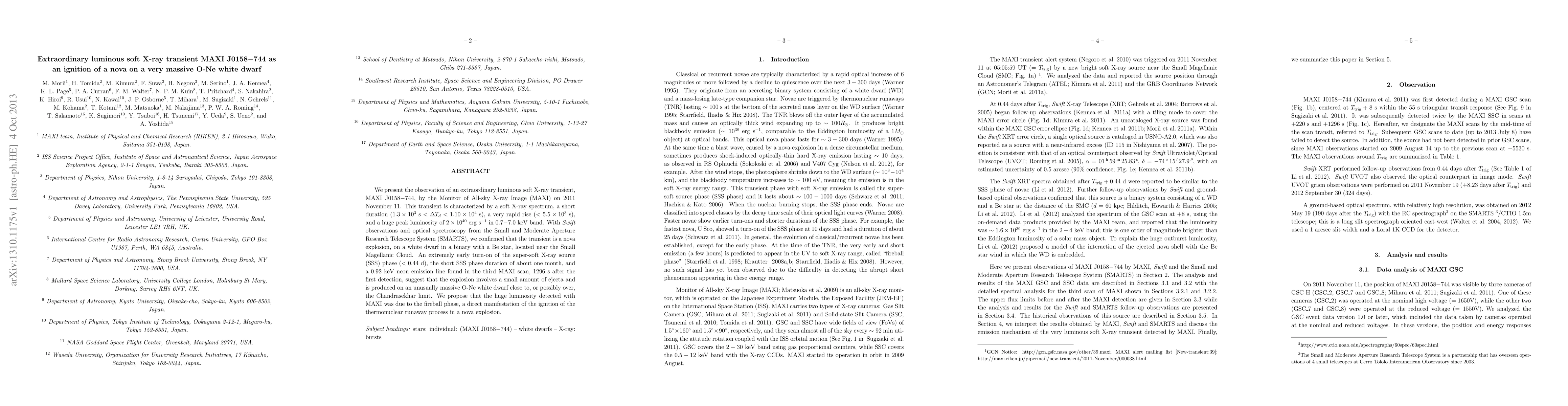 This paper reports the observation of the extraordinary luminous soft X-ray transient MAXI J0158-744, identified as a nova explosion on a very massive O-Ne white dwarf. The transient exhibited a rapid rise, short duration, and peak luminosity, suggesting a small ejecta amount and an ignition process close to the Chandrasekhar limit.
