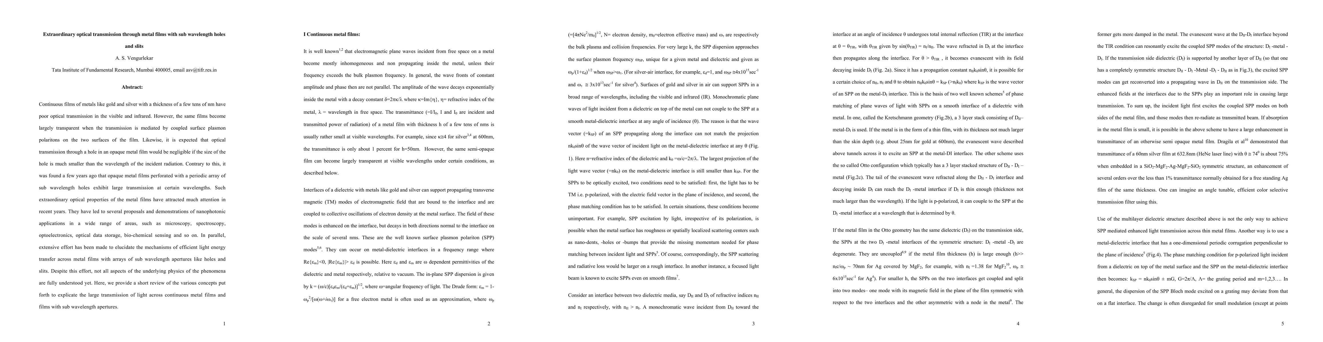 The paper provides a review of various concepts explaining large transmission of light across continuous metal films and films with sub-wavelength apertures, focusing on the roles of surface plasmon polaritons (SPPs) and localized surface plasmons (LSPs).
