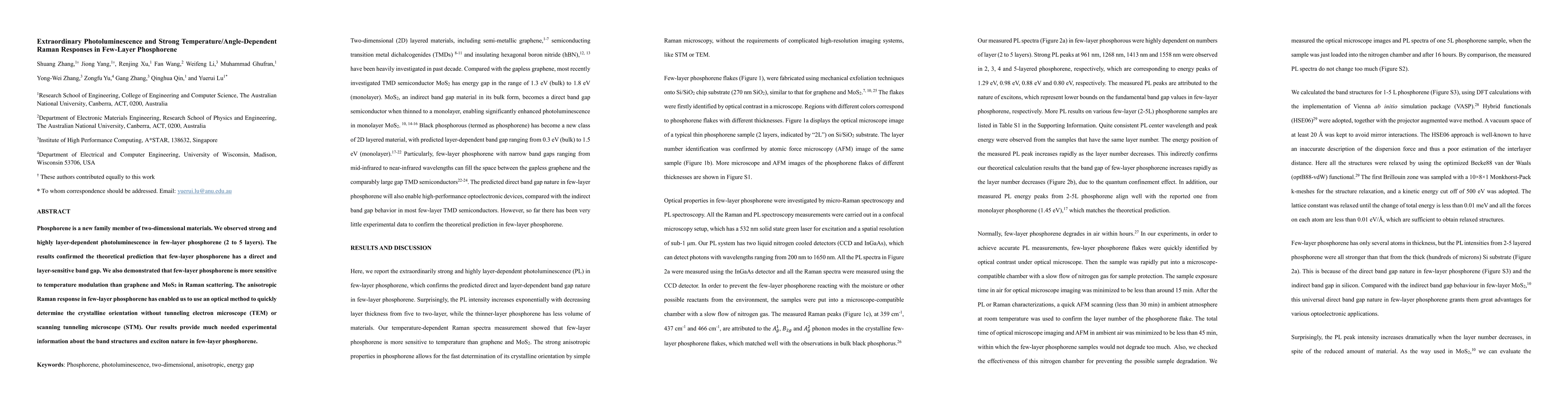 The paper presents a detailed analysis of the photoluminescence and Raman scattering properties of few-layer phosphorene, establishing its direct band gap and high temperature/angle-dependent Raman responses.