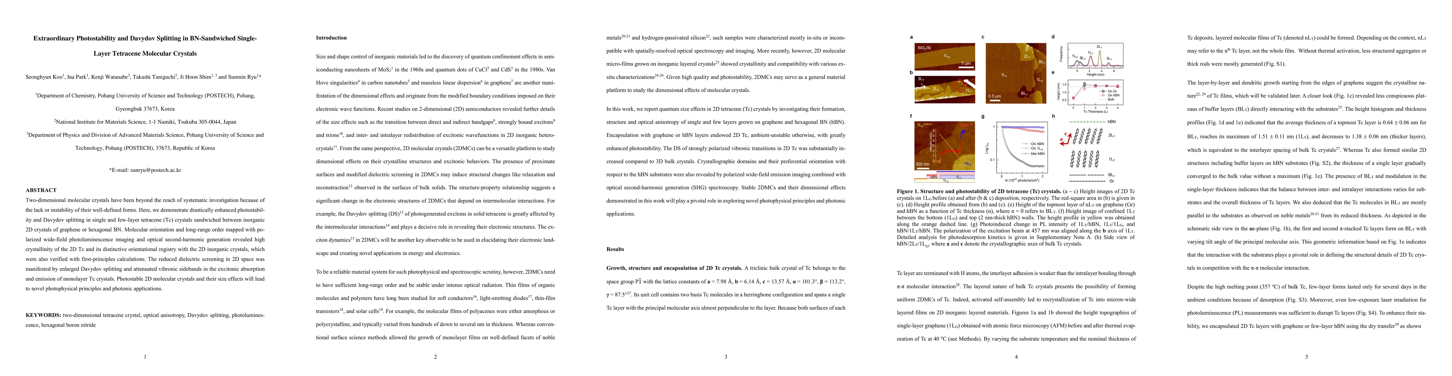 This paper demonstrates enhanced photostability and Davydov splitting in single-layer tetracene crystals sandwiched between graphene or hexagonal BN, revealing high crystallinity and distinctive orientational registry through polarized imaging and first-principles calculations. The reduced dielectric screening in 2D space results in significant Davydov splitting and attenuated vibronic sidebands, suggesting potential for novel photonic applications.