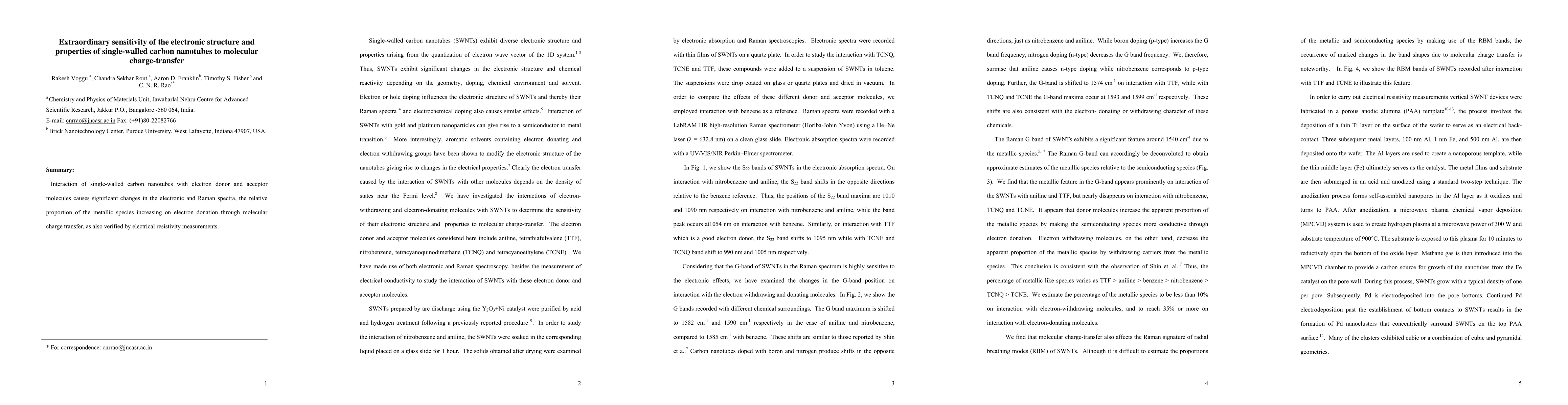 Single-walled carbon nanotubes exhibit remarkable sensitivity to molecular charge-transfer, with electron donor and acceptor interactions significantly altering their electronic and Raman spectra, and increasing the proportion of metallic species verified by electrical resistivity measurements.