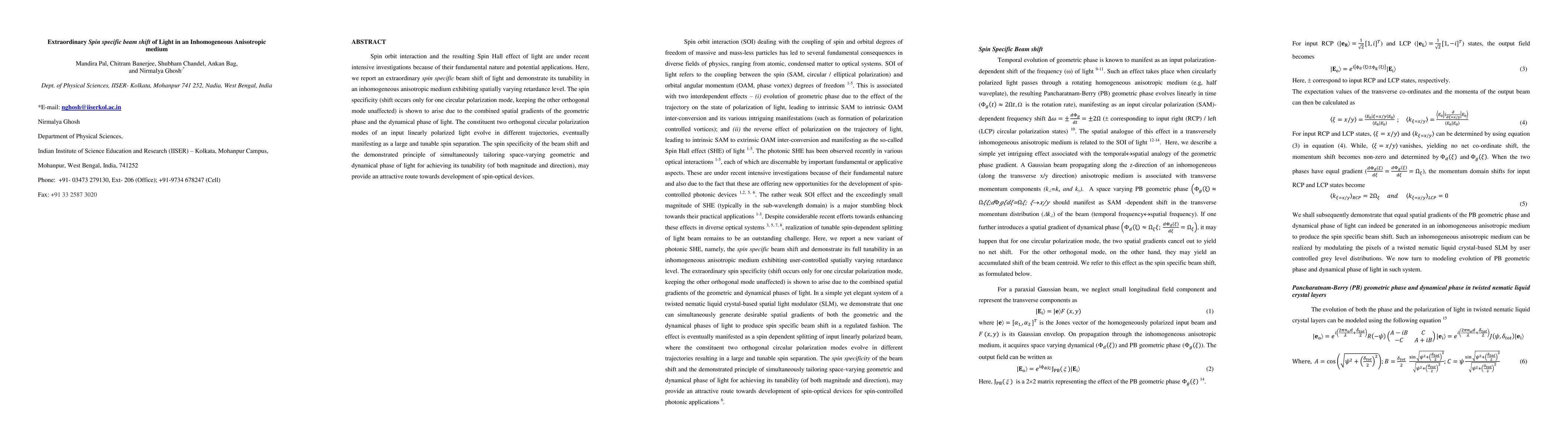 Spin orbit interaction and the resulting Spin Hall effect of light are under recent intensive investigations because of their fundamental nature and potential applications. Here, we report an extraordinary spin specific beam shift of light and demonstrate its tunability in an inhomogeneous anisotropic medium exhibiting spatially varying retardance level. The spin specificity (shift occurs only for one circular polarization mode, keeping the other orthogonal mode unaffected) is shown to arise due to the combined spatial gradients of the geometric phase and the dynamical phase of light. The constituent two orthogonal circular polarization modes of an input linearly polarized light evolve in different trajectories, eventually manifesting as a large and tunable spin separation. The spin specificity of the beam shift and the demonstrated principle of simultaneously tailoring space-varying geometric and dynamical phase of light for achieving its tunability (of both magnitude and direction), may provide an attractive route towards development of spin-optical devices.