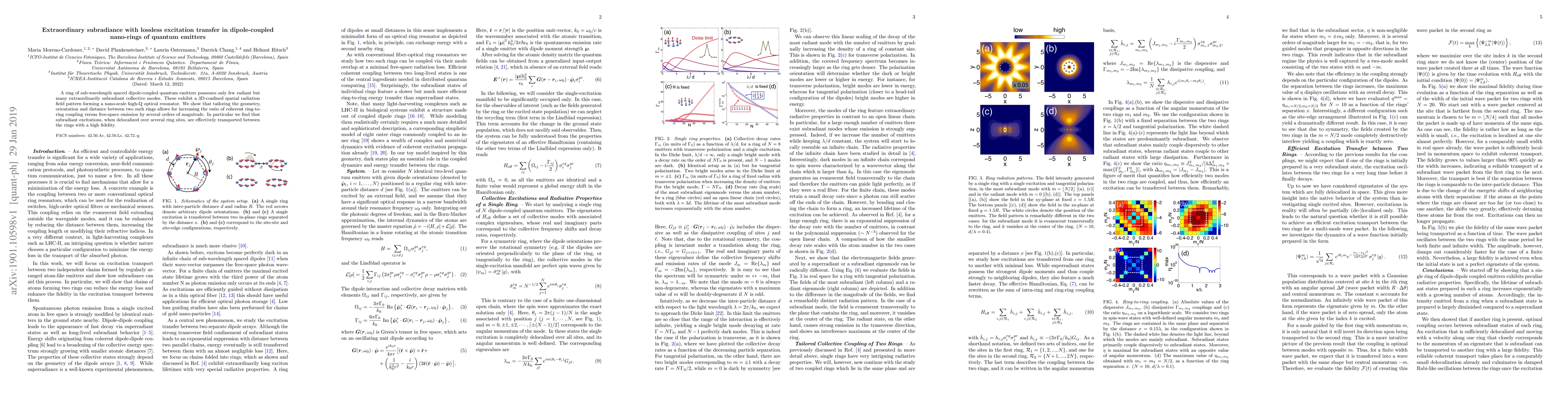 This paper investigates dipole-coupled nano-rings of quantum emitters, revealing that they support few radiant but many subradiant modes, forming a high-Q optical resonator. By adjusting the geometry and spacing between two rings, the study demonstrates a significant increase in coherent coupling versus free-space emission, with high fidelity transfer of delocalized subradiant excitations between the rings.