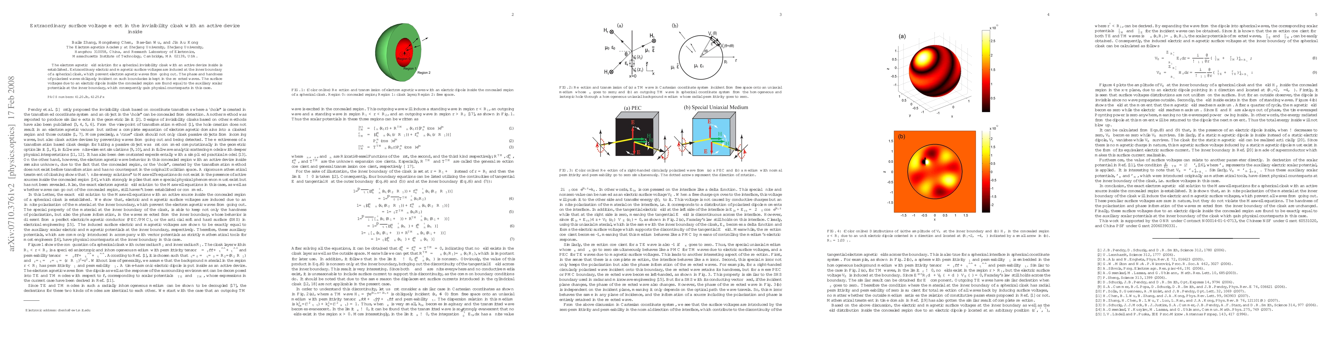 Summary: This paper establishes an electromagnetic solution for a spherical invisibility cloak with an active device, revealing induced extraordinary surface voltages that prevent wave leakage. These voltages maintain the phase and handedness of reflected waves, linking electric dipole effects inside the cloak to auxiliary scalar potentials at the inner boundary.
