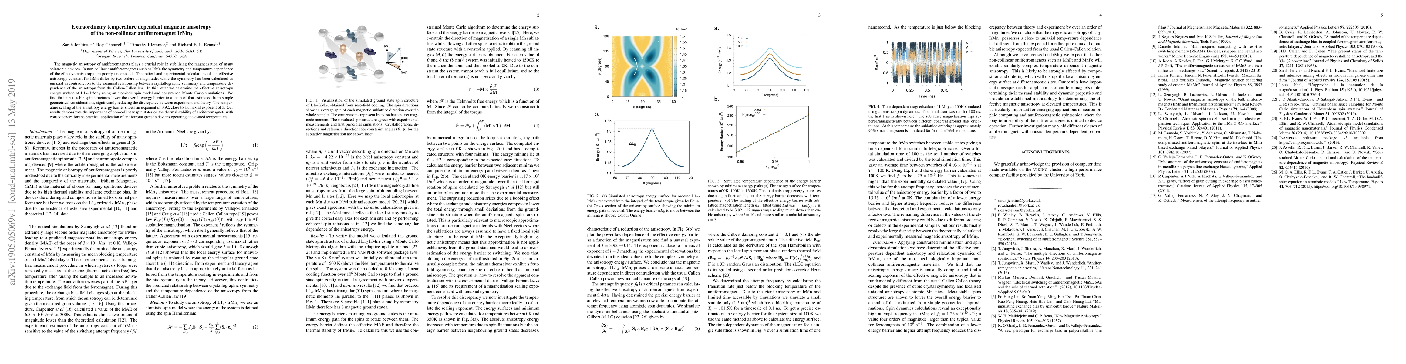 This paper investigates the temperature-dependent magnetic anisotropy of the non-collinear antiferromagnet IrMn, revealing that meta-stable spin structures significantly reduce the energy barrier, resolving discrepancies between theoretical and experimental results. The study finds a temperature scaling exponent close to uniaxial, highlighting the impact of non-collinear spin states on thermal stability in spintronic devices.