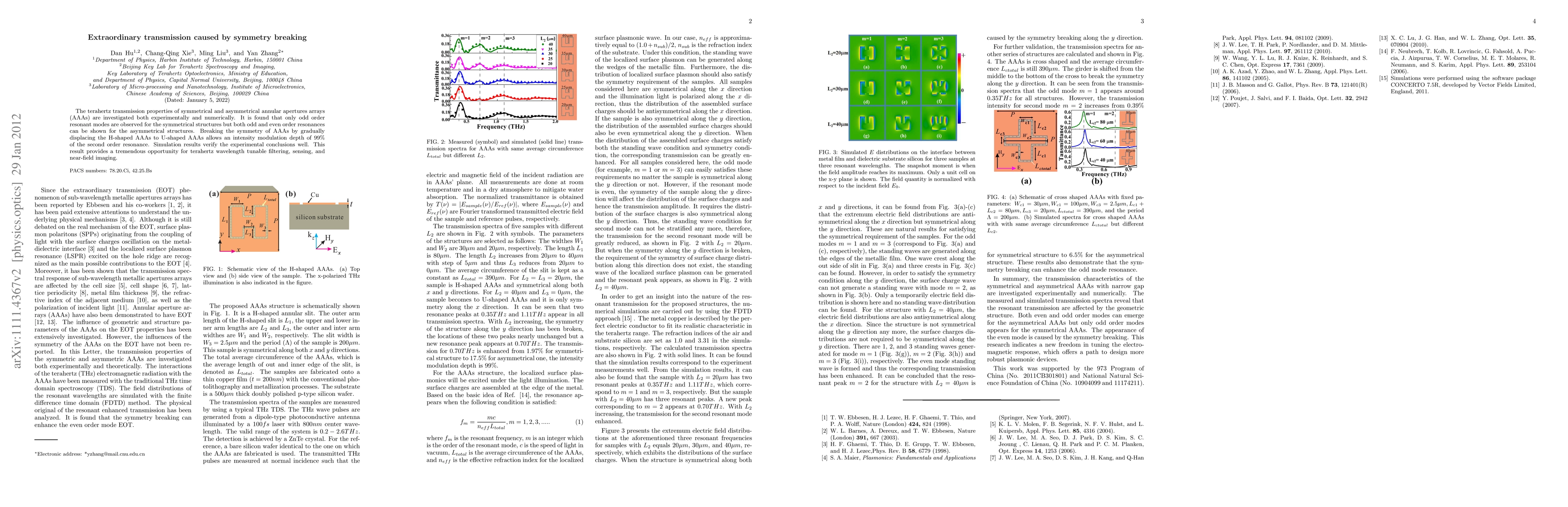 The terahertz transmission properties of symmetrical and asymmetrical annular apertures arrays (AAAs) are investigated both experimentally and numerically. It is found that only odd order resonant modes are observed for the symmetrical structures but both odd and even order resonances can be shown for the asymmetrical structures. Breaking the symmetry of AAAs by gradually displacing the H-shaped AAAs to U-shaped AAAs allows an intensity modulation depth of 99% of the second order resonance. Simulation results verify the experimental conclusions well. This result provides a tremendous opportunity for terahertz wavelength tunable filtering, sensing, and near-field imaging.