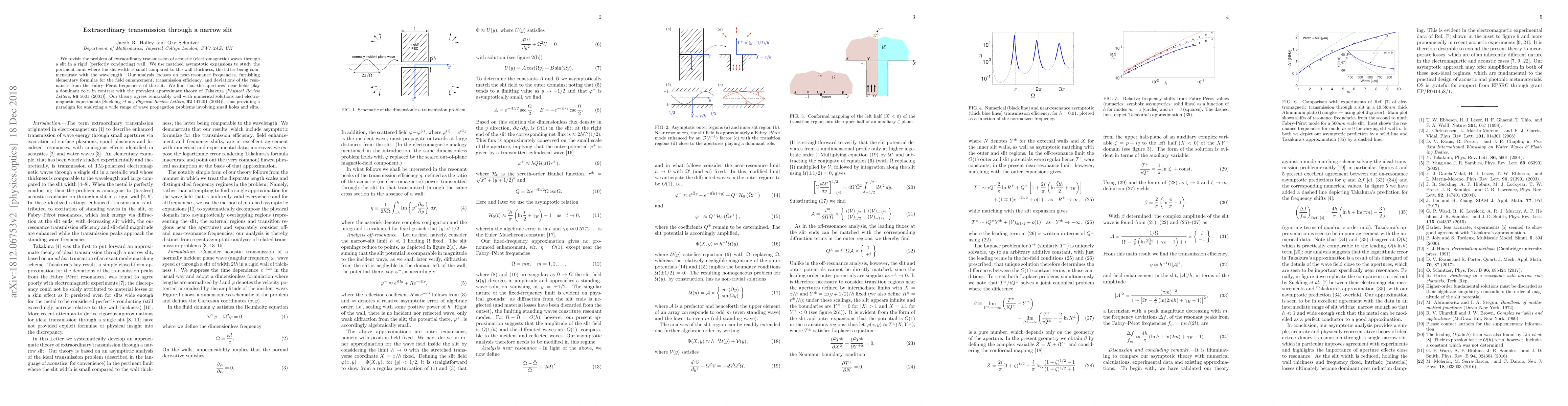 We revisit the problem of extraordinary transmission of acoustic (electromagnetic) waves through a slit in a rigid (perfectly conducting) wall. We use matched asymptotic expansions to study the pertinent limit where the slit width is small compared to the wall thickness, the latter being commensurate with the wavelength. Our analysis focuses on near-resonance frequencies, furnishing elementary formulae for the field enhancement, transmission efficiency, and deviations of the resonances from the Fabry-Perot frequencies of the slit. We find that the apertures' near fields play a dominant role, in contrast with the prevalent approximate theory of Takakura [Physical Review Letters, 86 5601 (2001)]. Our theory agrees remarkably well with numerical solutions and electromagnetic experiments [Suckling et al., Physical Review Letters, 92 147401 (2004)], thus providing a paradigm for analyzing a wide range of wave propagation problems involving small holes and slits.