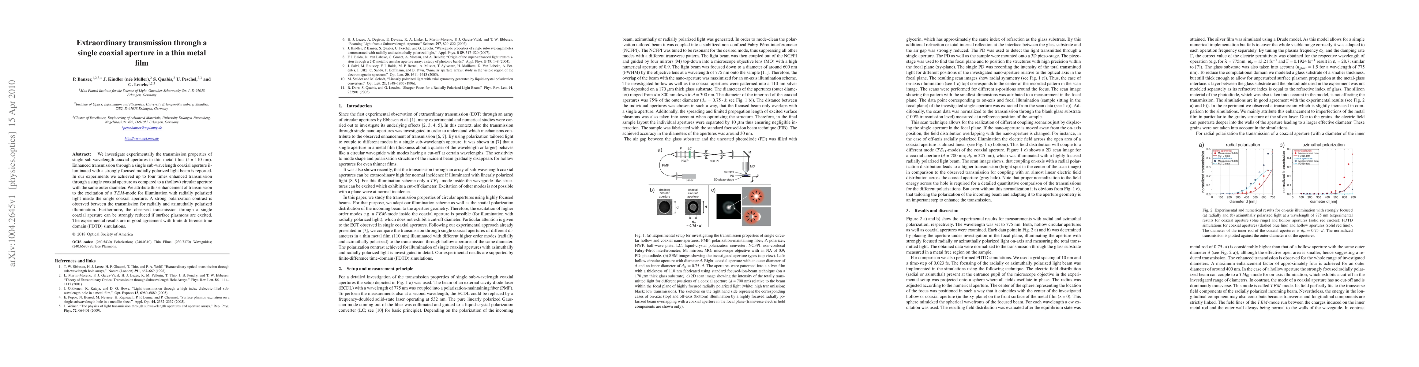 This paper experimentally investigates the enhanced transmission through a single coaxial aperture in a thin metal film, achieving up to four times the transmission compared to a circular aperture, attributed to the excitation of a TEM mode with radially polarized light. The study also highlights strong polarization dependence and the impact of surface plasmons on transmission, with results corroborated by FDTD simulations.