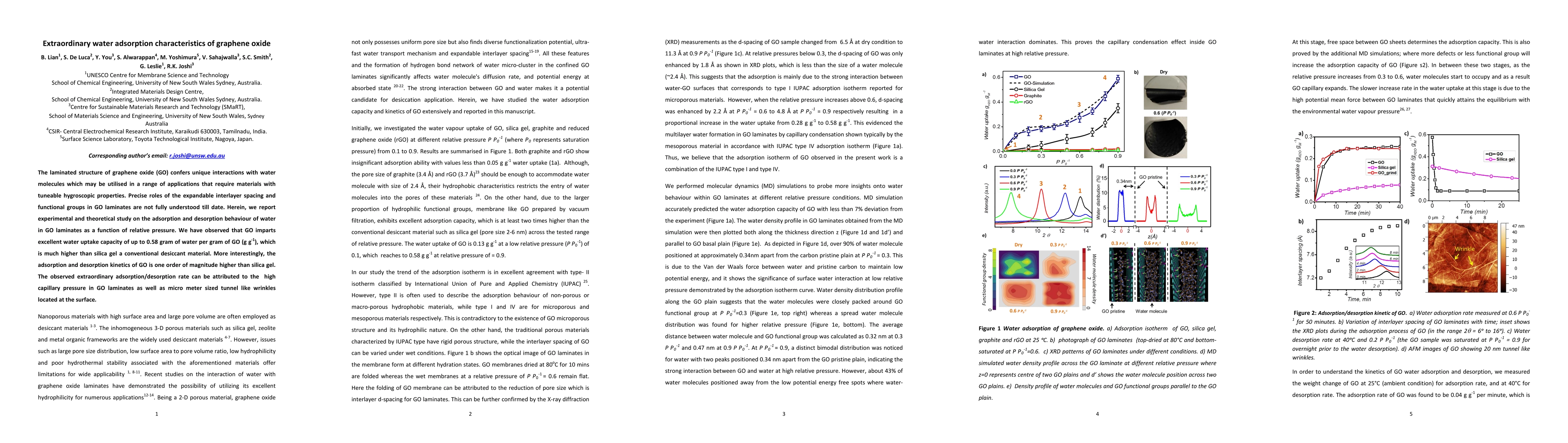 This research investigates the extraordinary water adsorption characteristics of graphene oxide (GO), revealing a water uptake capacity of up to 0.58 g of water per gram of GO, significantly higher than conventional desiccants like silica gel, due to its unique interlayer structure and functional groups.