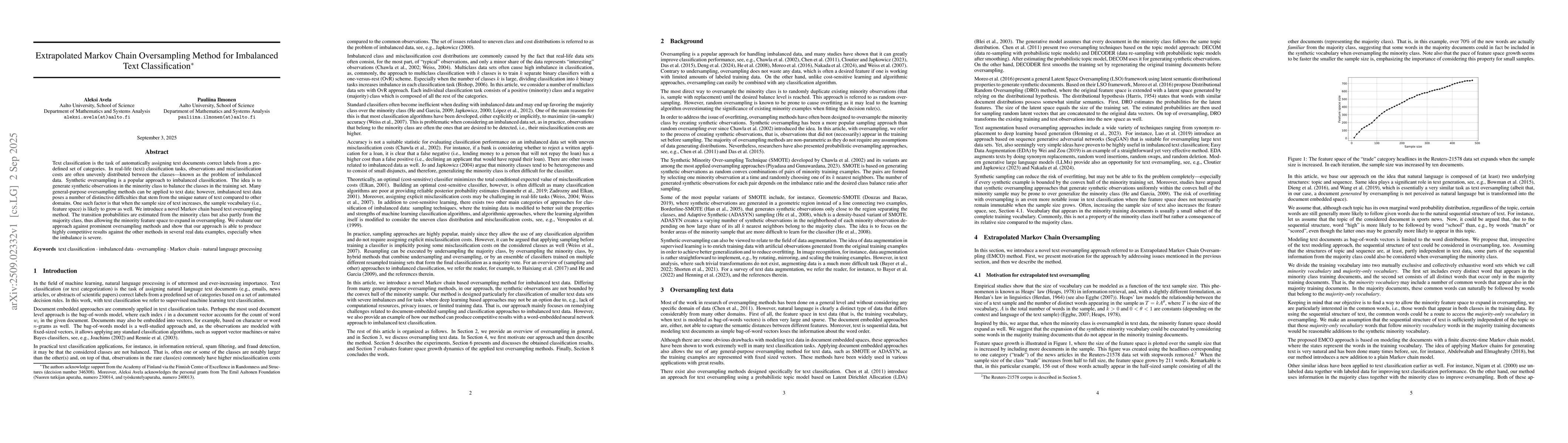 Text classification is the task of automatically assigning text documents correct labels from a predefined set of categories. In real-life (text) classification tasks, observations and misclassification costs are often unevenly distributed between the classes - known as the problem of imbalanced data. Synthetic oversampling is a popular approach to imbalanced classification. The idea is to generate synthetic observations in the minority class to balance the classes in the training set. Many general-purpose oversampling methods can be applied to text data; however, imbalanced text data poses a number of distinctive difficulties that stem from the unique nature of text compared to other domains. One such factor is that when the sample size of text increases, the sample vocabulary (i.e., feature space) is likely to grow as well. We introduce a novel Markov chain based text oversampling method. The transition probabilities are estimated from the minority class but also partly from the majority class, thus allowing the minority feature space to expand in oversampling. We evaluate our approach against prominent oversampling methods and show that our approach is able to produce highly competitive results against the other methods in several real data examples, especially when the imbalance is severe.