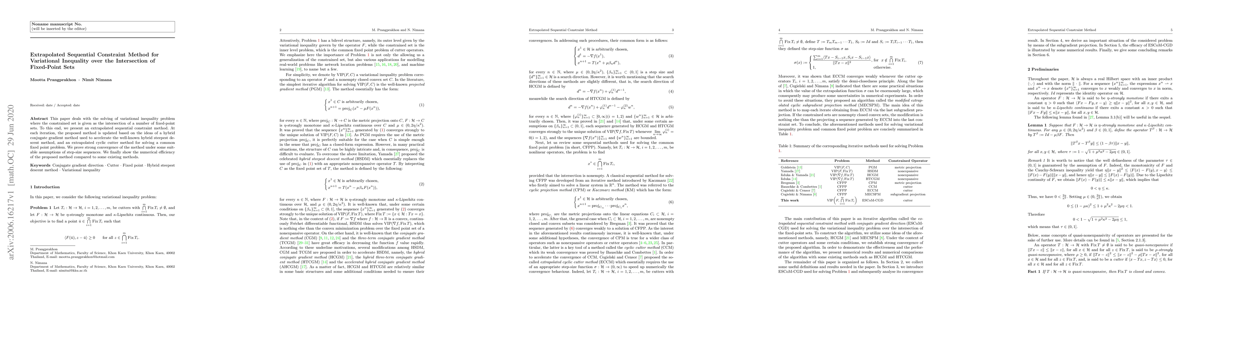 This paper introduces an extrapolated sequential constraint method to solve variational inequality problems constrained by the intersection of fixed-point sets. The method combines a hybrid conjugate gradient approach with an extrapolated cyclic cutter method, proving strong convergence under certain assumptions and demonstrating its numerical efficiency.