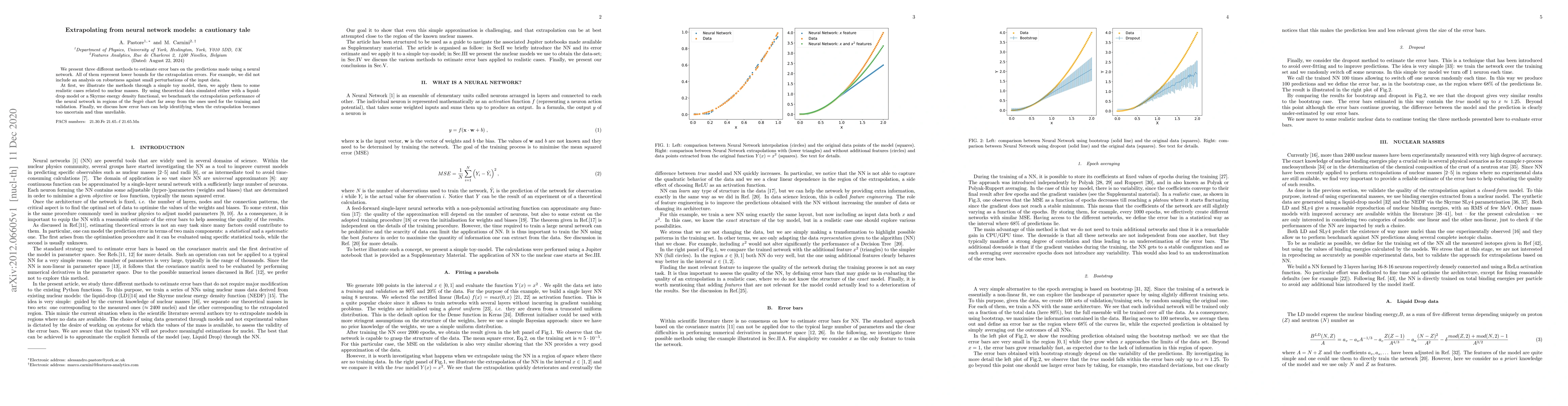 We present three different methods to estimate error bars on the predictions made using a neural network. All of them represent lower bounds for the extrapolation errors. For example, we did not include an analysis on robustness against small perturbations of the input data. At first, we illustrate the methods through a simple toy model, then, we apply them to some realistic cases related to nuclear masses. By using theoretical data simulated either with a liquid-drop model or a Skyrme energy density functional, we benchmark the extrapolation performance of the neural network in regions of the Segr\`e chart far away from the ones used for the training and validation. Finally, we discuss how error bars can help identifying when the extrapolation becomes too uncertain and thus unreliable