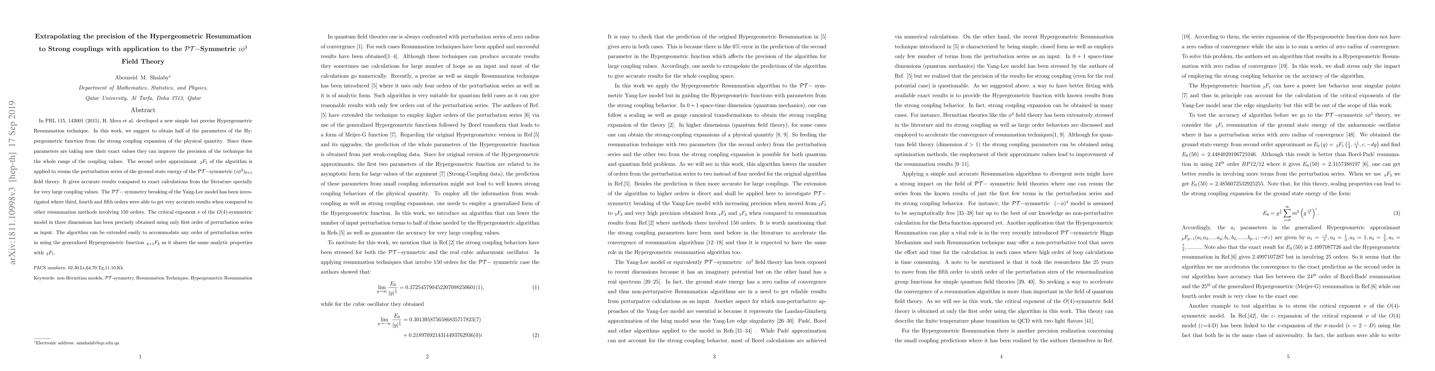 In PRL 115, 143001 (2015), H. Mera et al. developed a new simple but precise Hypergeometric Resummation technique. In this work, we suggest to obtain half of the parameters of the Hypergeometric function from the strong coupling expansion of the physical quantity. Since these parameters are taking now their exact values they can improve the precision of the technique for the whole range of the coupling values. The second order approximant $\,_{2}F_{1}$ of the algorithm is applied to resum the perturbation series of the ground state energy of the $\mathcal{PT-}$symmetric $(i\phi^{3})_{0+1}$ field theory. It gives accurate results compared to exact calculations from the literature specially for very large coupling values. The $\mathcal{PT-}$ symmetry breaking of the Yang-Lee model has been investigated where third, fourth and fifth orders were able to get very accurate results when compared to other resummation methods involving $150$ orders. The critical exponent $\nu$ of the $O(4)$-symmetric model in three dimensions has been precisely obtained using only first order of perturbation series as input. The algorithm can be extended easily to accommodate any order of perturbation series in using the generalized Hypergeometric function $\,_{k+1}F_{k}$ as it shares the same analytic properties with $\,_{2}F_{1}$.