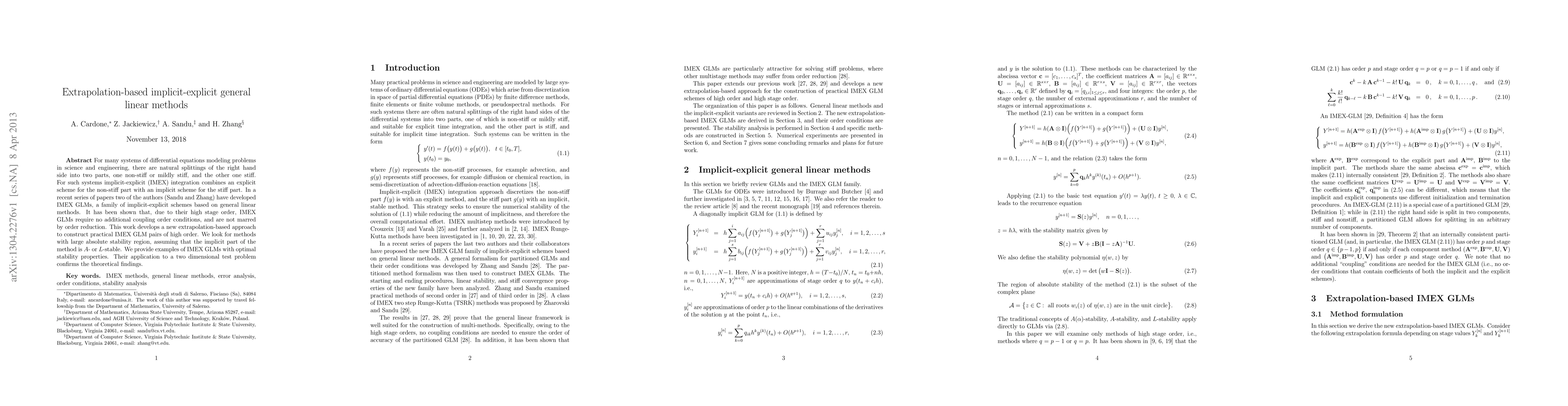 This paper introduces a new extrapolation-based method for constructing high-order implicit-explicit general linear methods (IMEX GLMs) for solving differential equations with stiff and non-stiff components. The proposed methods exhibit large absolute stability regions and optimal stability properties, validated through practical application to a two-dimensional test problem.