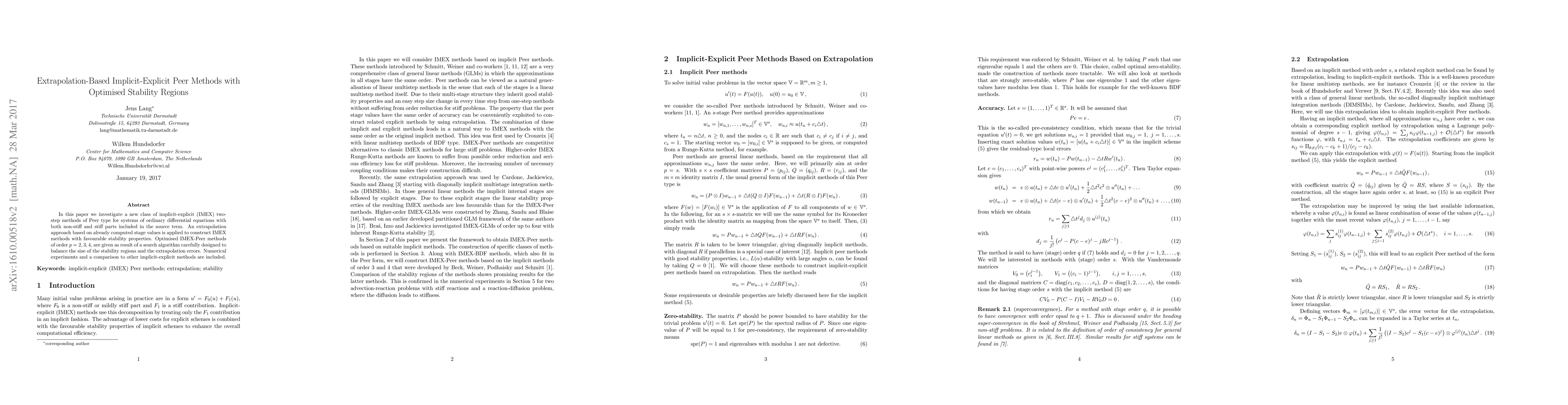 This paper introduces new implicit-explicit (IMEX) Peer methods for solving ordinary differential equations with mixed stiffness, employing an extrapolation technique to enhance stability. The proposed methods, optimized for orders p = 2, 3, 4, balance stability regions and extrapolation errors, and are compared numerically against other IMEX methods.
