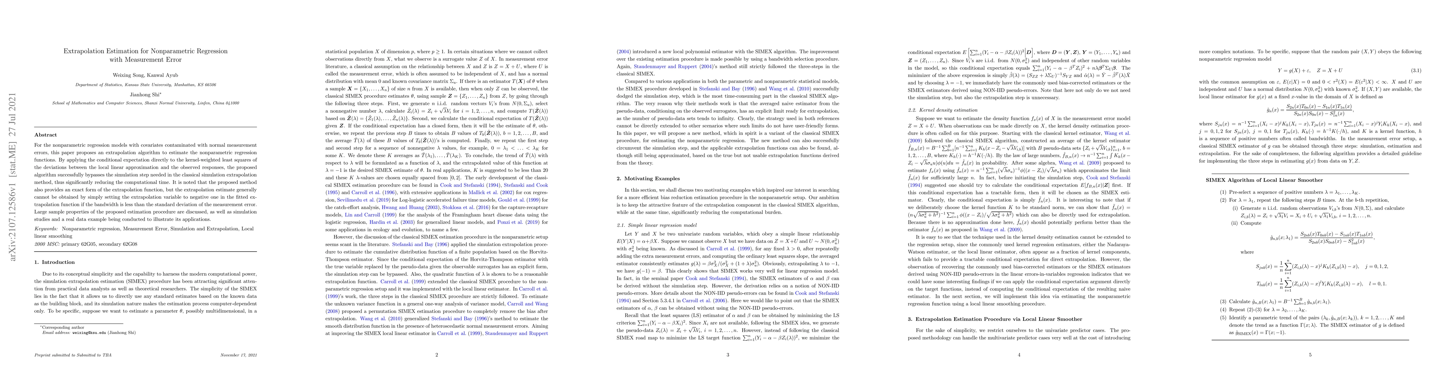 This paper proposes an extrapolation algorithm for nonparametric regression with measurement error, bypassing the simulation step to reduce computational time. The method provides an exact form of the extrapolation function but requires careful consideration of bandwidth relative to measurement error for accurate estimates.