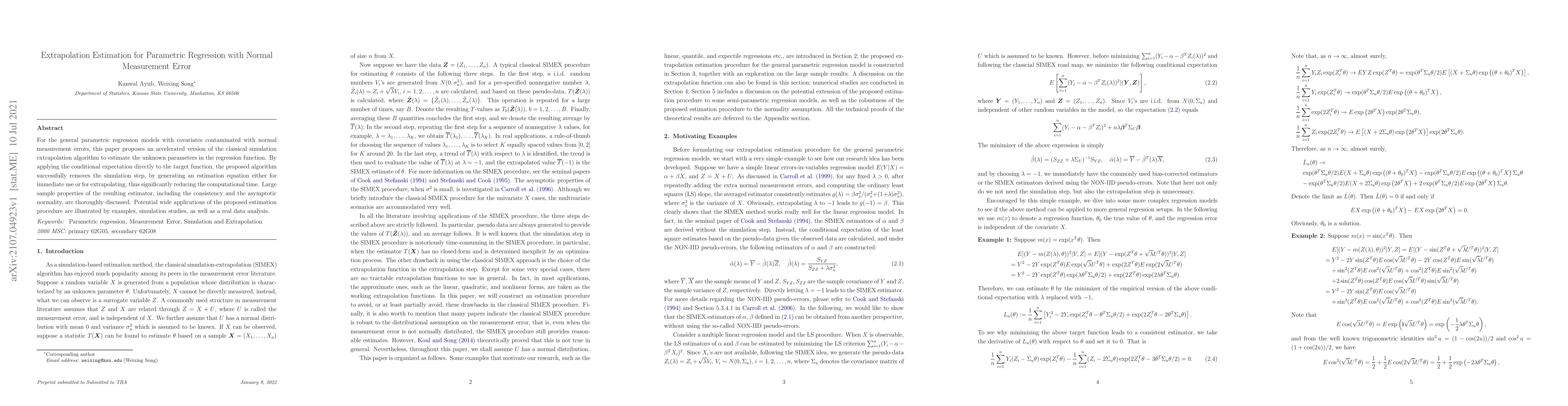 This paper introduces an accelerated simulation extrapolation algorithm for estimating parameters in parametric regression models with normal measurement errors, eliminating the simulation step to reduce computational time. The method's consistency and asymptotic normality are analyzed, and its practical applications are demonstrated through simulations and real data analysis.
