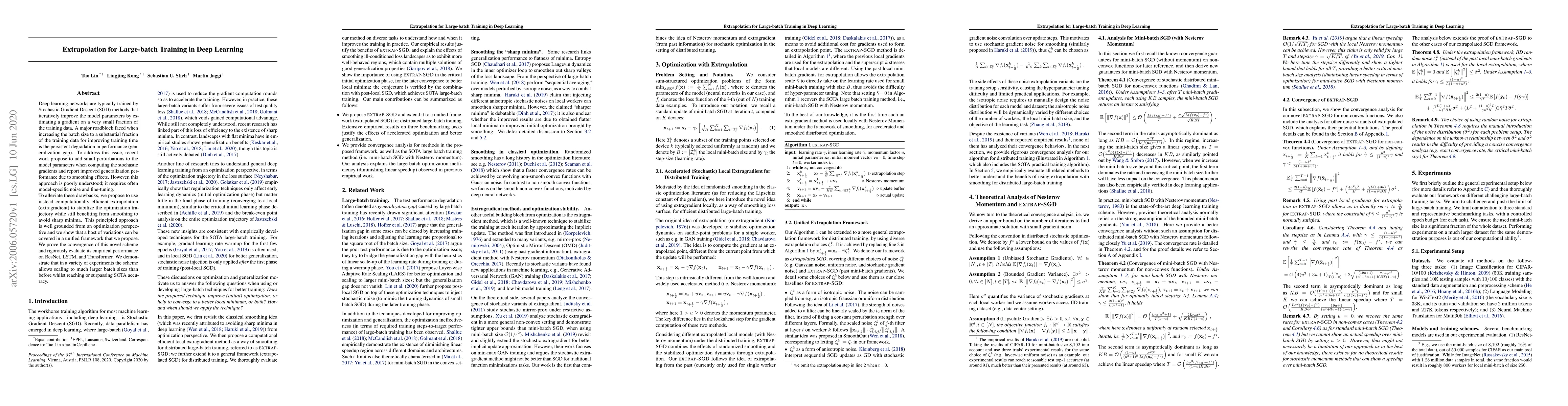 Deep learning networks are typically trained by Stochastic Gradient Descent (SGD) methods that iteratively improve the model parameters by estimating a gradient on a very small fraction of the training data. A major roadblock faced when increasing the batch size to a substantial fraction of the training data for improving training time is the persistent degradation in performance (generalization gap). To address this issue, recent work propose to add small perturbations to the model parameters when computing the stochastic gradients and report improved generalization performance due to smoothing effects. However, this approach is poorly understood; it requires often model-specific noise and fine-tuning. To alleviate these drawbacks, we propose to use instead computationally efficient extrapolation (extragradient) to stabilize the optimization trajectory while still benefiting from smoothing to avoid sharp minima. This principled approach is well grounded from an optimization perspective and we show that a host of variations can be covered in a unified framework that we propose. We prove the convergence of this novel scheme and rigorously evaluate its empirical performance on ResNet, LSTM, and Transformer. We demonstrate that in a variety of experiments the scheme allows scaling to much larger batch sizes than before whilst reaching or surpassing SOTA accuracy.