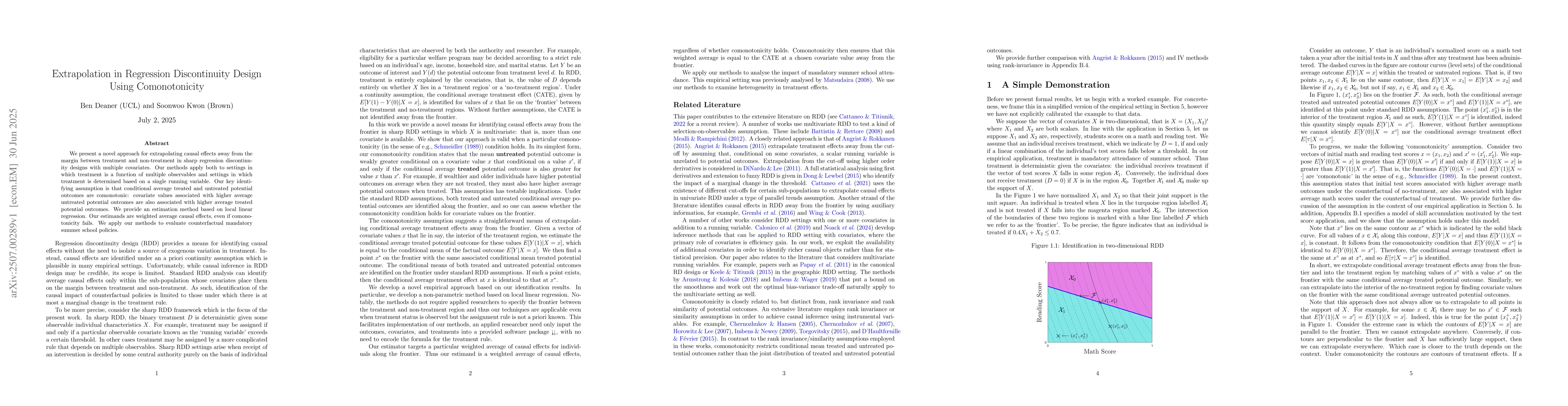 We present a novel approach for extrapolating causal effects away from the margin between treatment and non-treatment in sharp regression discontinuity designs with multiple covariates. Our methods apply both to settings in which treatment is a function of multiple observables and settings in which treatment is determined based on a single running variable. Our key identifying assumption is that conditional average treated and untreated potential outcomes are comonotonic: covariate values associated with higher average untreated potential outcomes are also associated with higher average treated potential outcomes. We provide an estimation method based on local linear regression. Our estimands are weighted average causal effects, even if comonotonicity fails. We apply our methods to evaluate counterfactual mandatory summer school policies.
